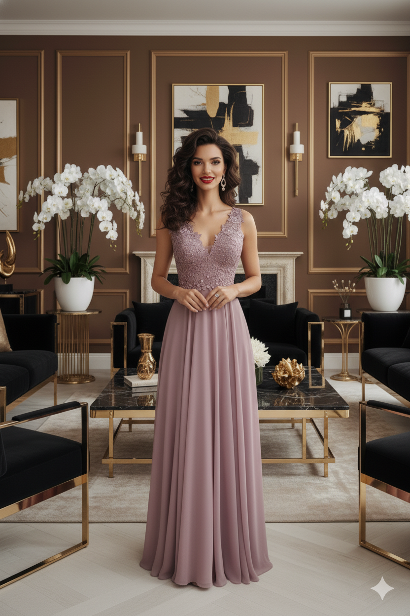• Csipkés flitteres mályvarózsaszín muszlin maxi ruha