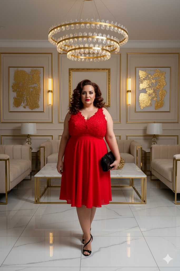 • Csipkés térd piros gyöngyös push-up muszlin molett ruha