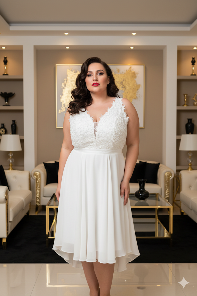 • Csipkés térdig érő fehér gyöngyös push-up muszlin molett ruha