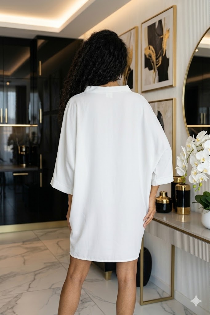 Az Alita zsákruha tökéletes választás a laza, mégis nőies megjelenés kedvelőinek. A bő fazon és a magasított nyakkivágás modern eleganciát kölcsönöz, miközben a 3/4-es denevér ujjak extra kényelmet biztosítanak.