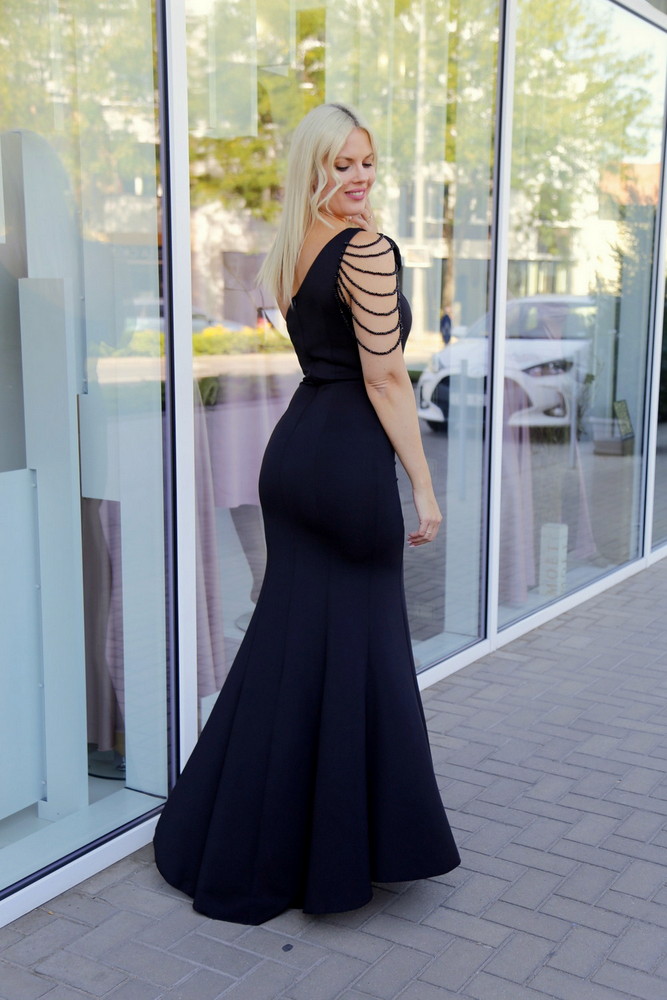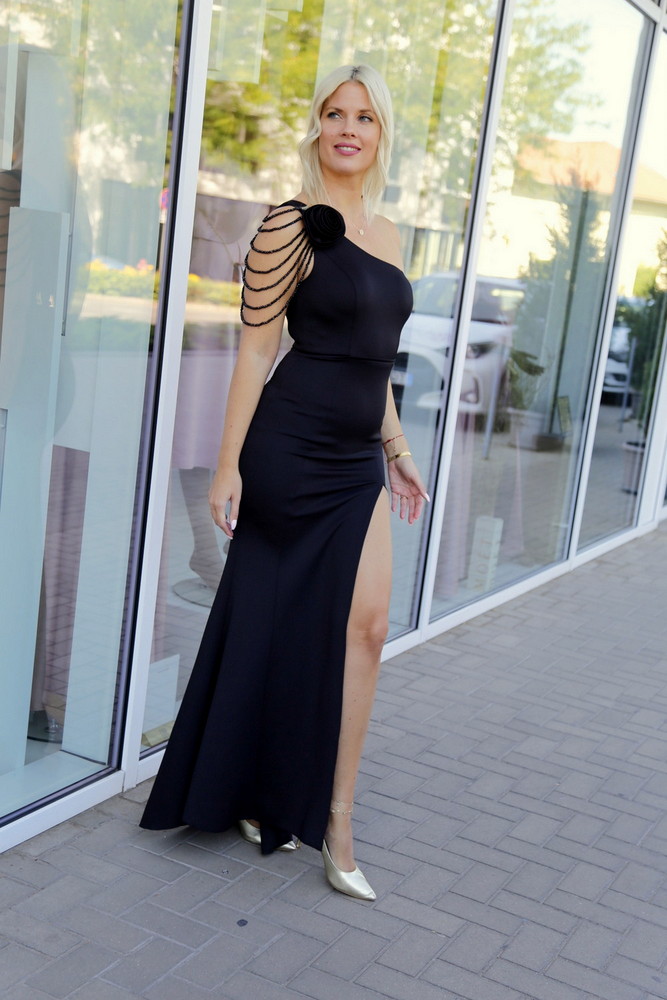 Az Amadea fekete félvállas maxi ruha a bátorság és elegancia tökéletes kombinációja. A sellő fazon és a díszített részletek kiemelik az alakot, míg a rózsa és kövek hozzáadják a különleges, egyedi megjelenést.