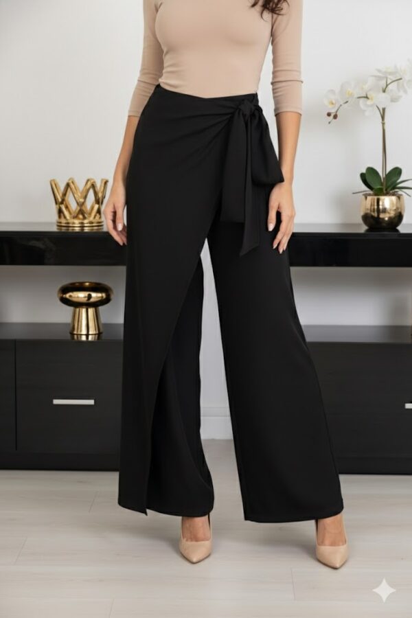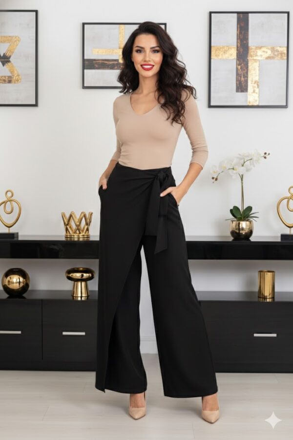 Az Amélia fekete átlapolt bőszárú nadrág egy igazán stílusos, modern darab, amely egyszerre kelti egy hosszú szoknya és egy elegáns nadrág hatását. Az átlapolt eleje finoman mozog járás közben, nőies és kifinomult megjelenést adva a viselőjének. A deréknál elhelyezett megkötő hangsúlyos masnija nemcsak praktikus, hanem látványos díszítőelem is.