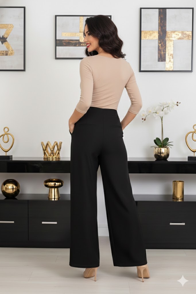 A bő száraknak köszönhetően kényelmes viselet, miközben optikailag nyújtja a lábakat. Letisztult felülete miatt könnyen kombinálható testhezálló toppal, blúzzal vagy akár alkalmi felsővel is. Tökéletes választás elegáns eseményekre, vacsorákra, de akár egy stílusos hétköznapi szett részeként is megállja a helyét.