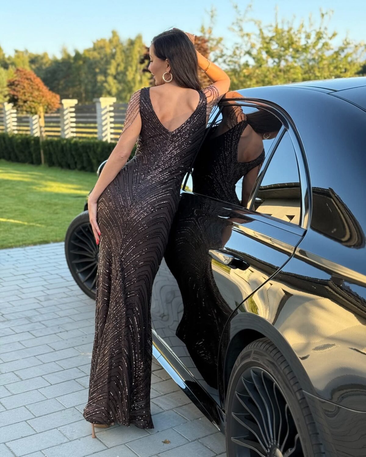 A V-kivágású dekoltázs és az ujjatlan dizájn modern és szexi megjelenést biztosít, miközben a hátul cipzáros záródás kényelmes viseletet garantál. A maxi hosszúság eleganciát kölcsönöz, a flitterek pedig igazán különlegessé teszik ezt az alkalmi ruhát.