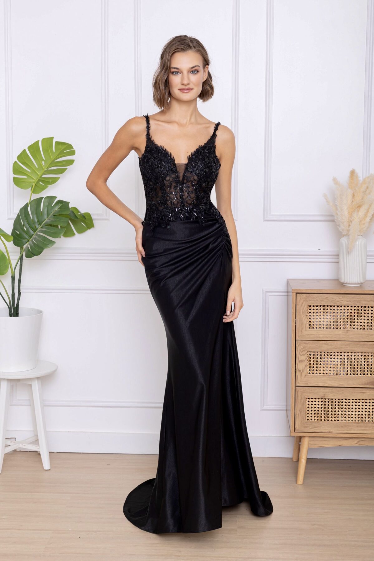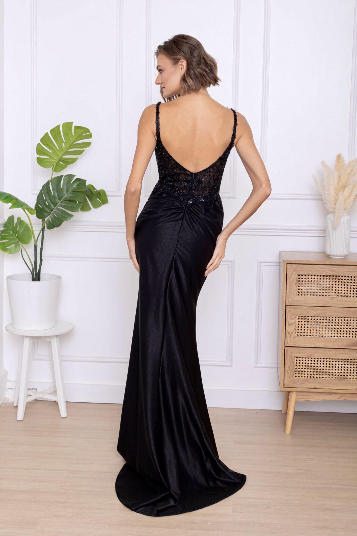 Az Angelia fekete flitteres maxi ruha igazi statement darab, amely minden elegáns eseményen magára irányítja a figyelmet. A ruha felsőrésze finoman áttetsző alapra varrt flitterekkel díszített, ami luxus hatást kelt, és elegánsan kiemeli a dekoltázst. A spagetti pántok modern és kifinomult vonalvezetést adnak, miközben stabil tartást biztosítanak.