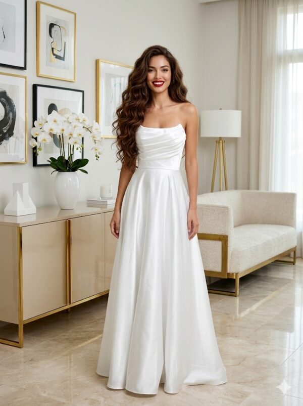 Az Angelina fehér pánt nélküli szatén maxi ruha a minimalista elegancia megtestesítője. A pánt nélküli kialakítás letisztult, nőies hatást kelt, míg a szatén anyag finom fénye luxusérzetet ad az összképnek. A derékban szabott, A-vonalú fazon kiemeli a nőies vonalakat, miközben kényelmes és időtálló megjelenést biztosít.