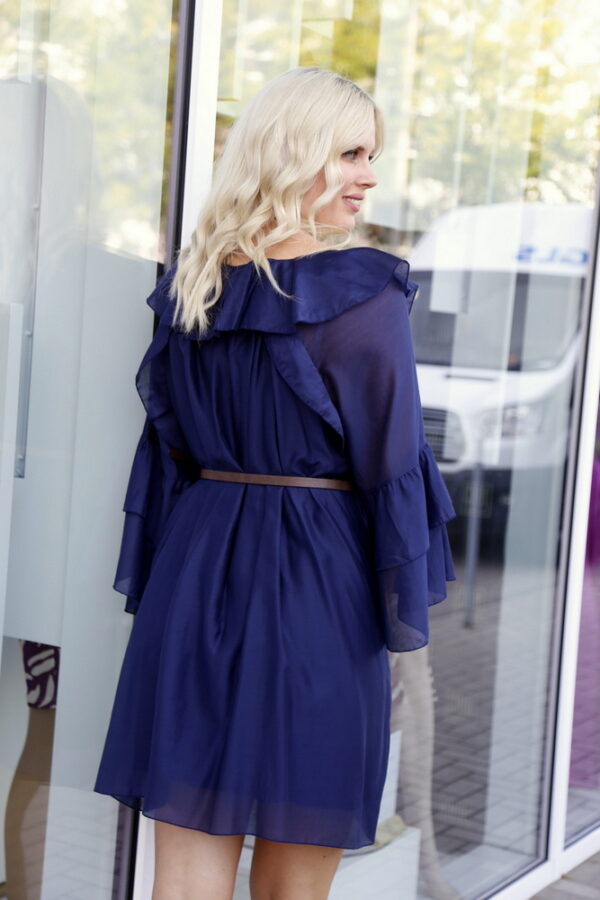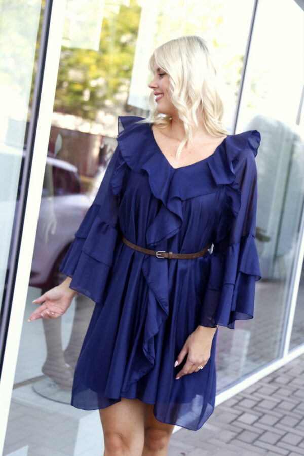 Az Annabella fodros ruha/tunika elegáns és kényelmes választás, amely nőies részleteivel és stílusos kiegészítőjével, a barna övvel emeli ki a derékvonalat. A hosszú, bővebb ujjak és a V-nyak klasszikus, mégis modern megjelenést biztosítanak.