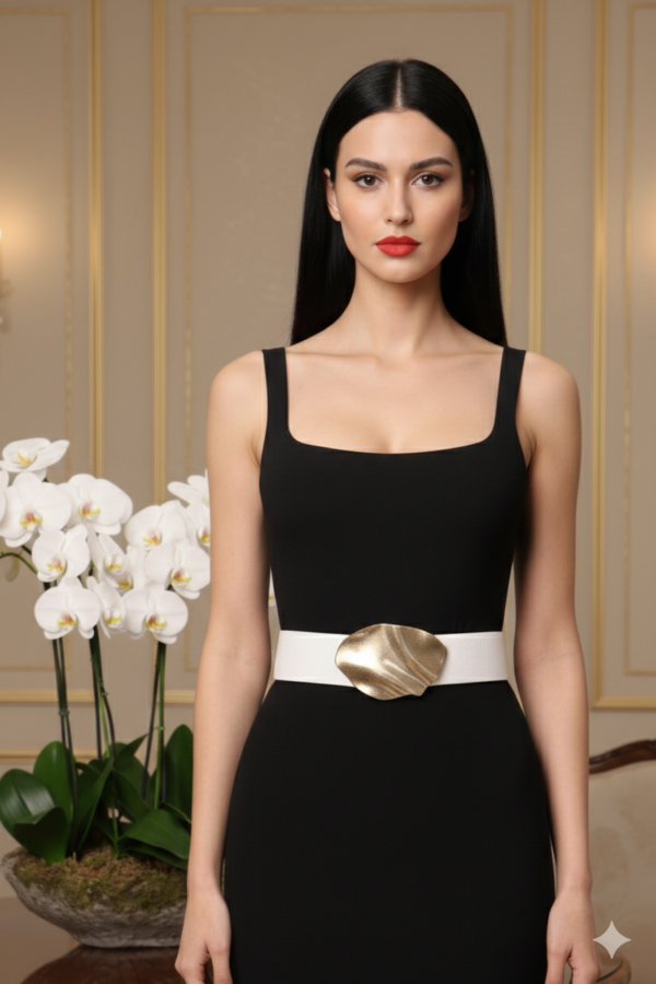 A kb. 6 cm-es szélesség optikailag karcsúsít, hangsúlyozza a derekat, és nőies sziluettet teremt. Az elöl elhelyezett amorf, ovális formájú matt csat modern és elegáns hatást kelt, visszafogottan feldobva az összképet. Az állítható bőségnek köszönhetően könnyen igazítható, így többféle fazonhoz és mérethez is ideális.