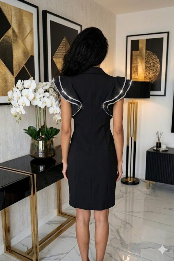 Ha olyan ruhadarabot keresel, ami egyszerre elegáns, nőies és látványosan különleges, ez a köves részletekkel díszített, galléros fazon garantáltan a kedvenced lesz. A V-kivágás finoman kiemeli a felsőrészt, a vállon futó fodrok pedig romantikus, trendkövető hangulatot adnak – ráadásul a köves díszítésnek köszönhetően minden fényben gyönyörűen érvényesül.