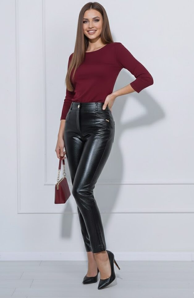 A gombos és cipzáras záródás biztos tartást ad, míg a hozzá tartozó műbőr öv elegáns, nőies részlet, amely még stílusosabbá teszi a nadrágot. Ez a fekete bőrhatású nadrág ideális választás lehet irodába, esti programokra vagy akár hétköznapi szettekhez is.