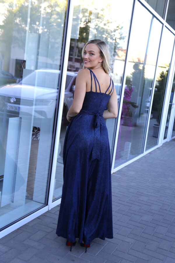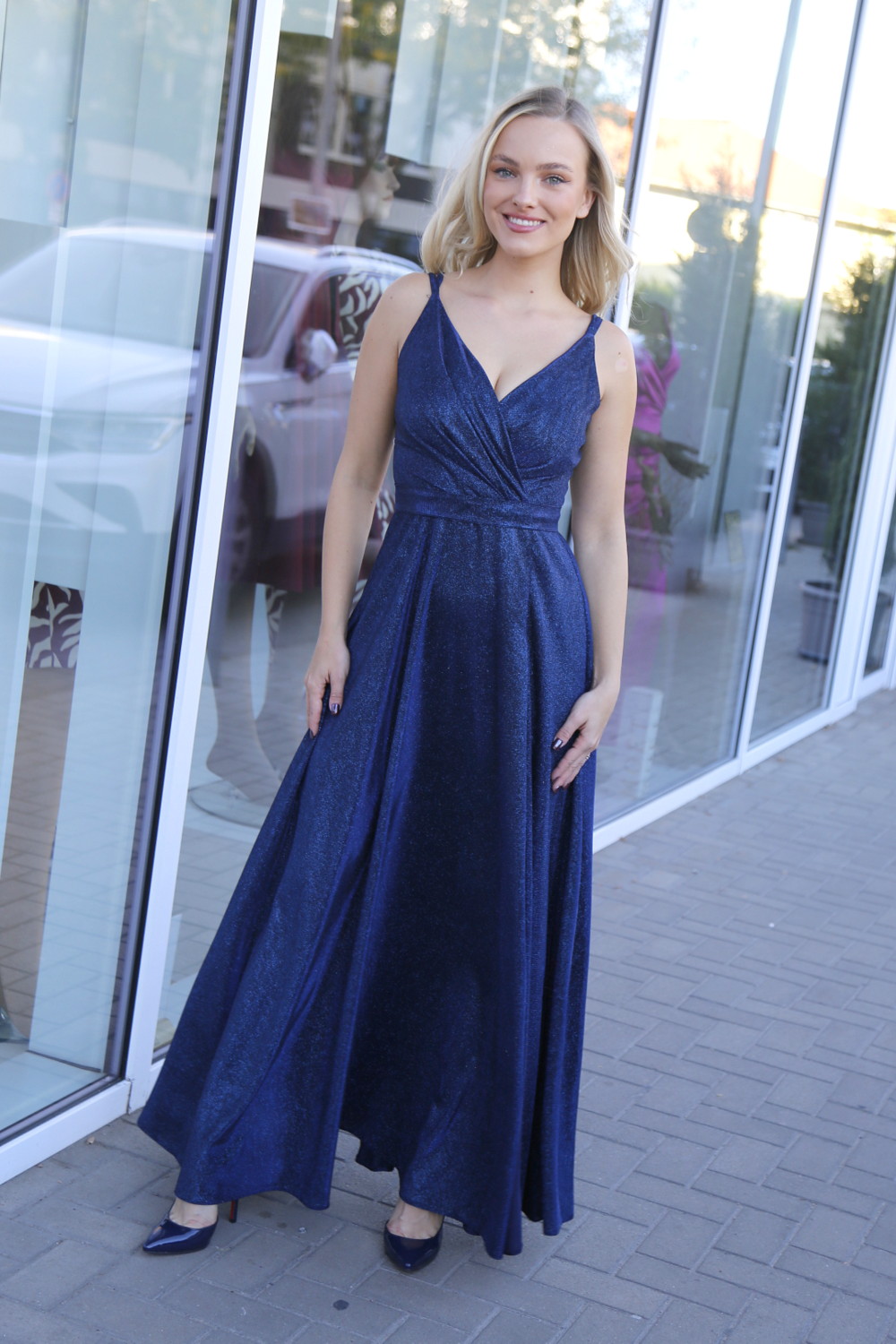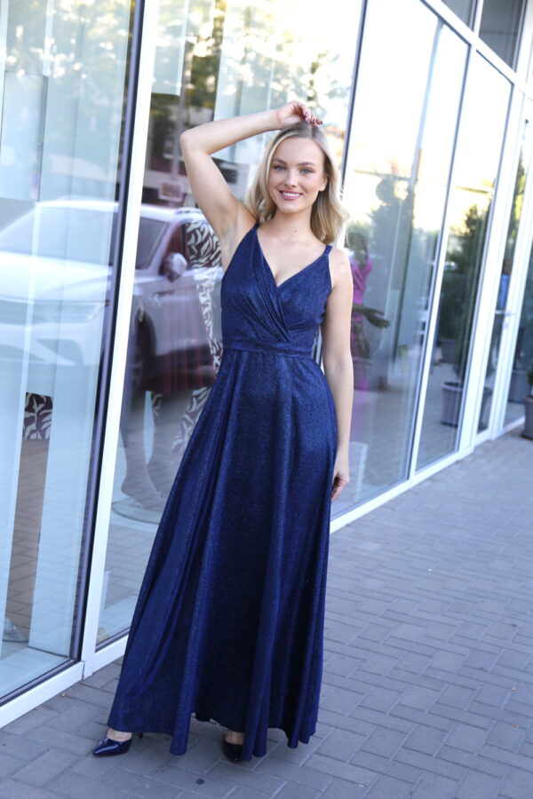 A Bertilla sötétkék csillogós ruha a tökéletes választás, ha igazán elegáns és figyelemfelkeltő megjelenésre vágysz. A maxi hosszúság, az ujjtalan dizájn és az anyagában csillogó lurex szálak egyedi, ragyogó hatást keltenek, miközben a dekoltált mellrész és az átlapolt szabás nőies vonalakat formál.