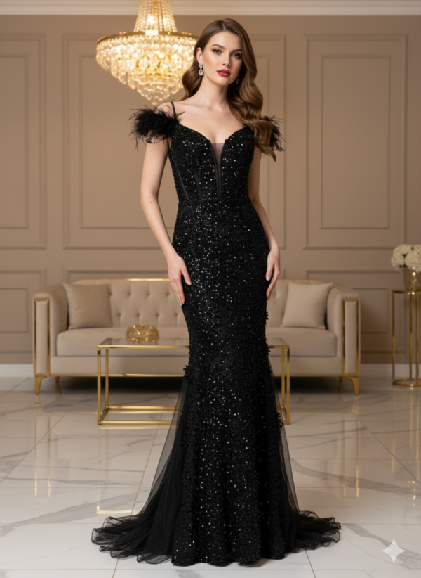 Az ejtett vállakra simuló tollas részletek exkluzív, couture jellegű megoldást nyújtanak, míg a spagetti pánt stabil tartást ad a felsőrésznek. A hátsó cipzáras kialakítás könnyed felvételt biztosít.