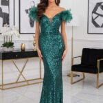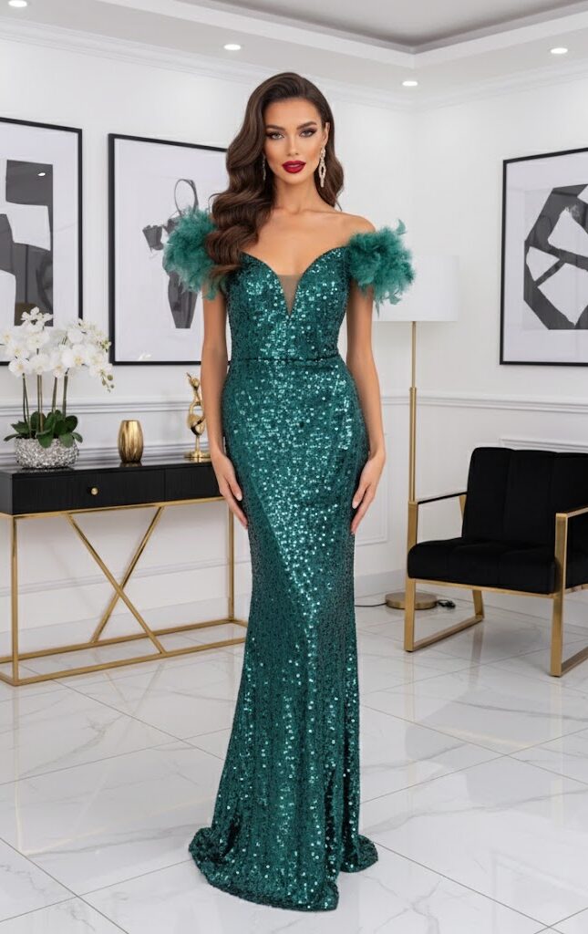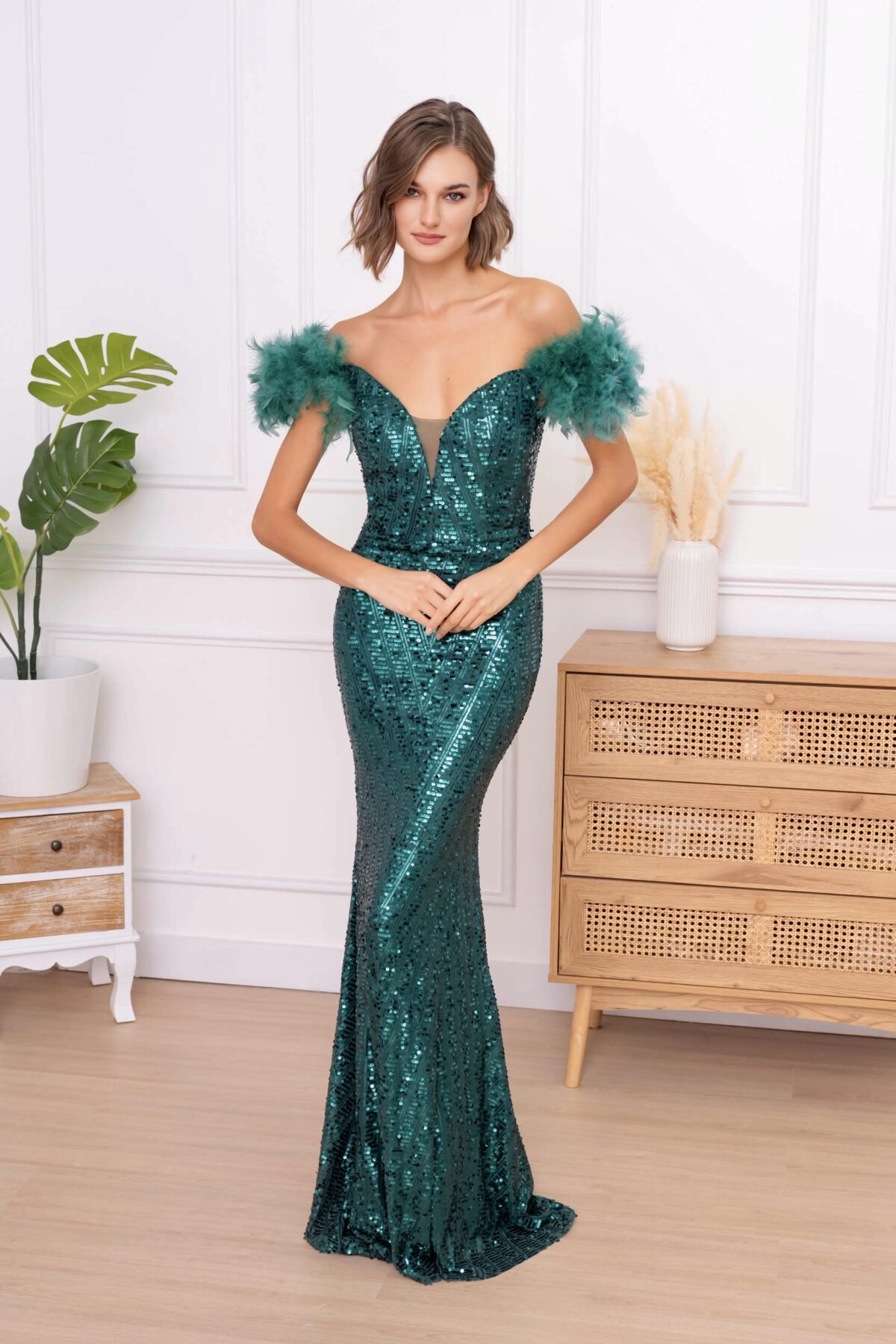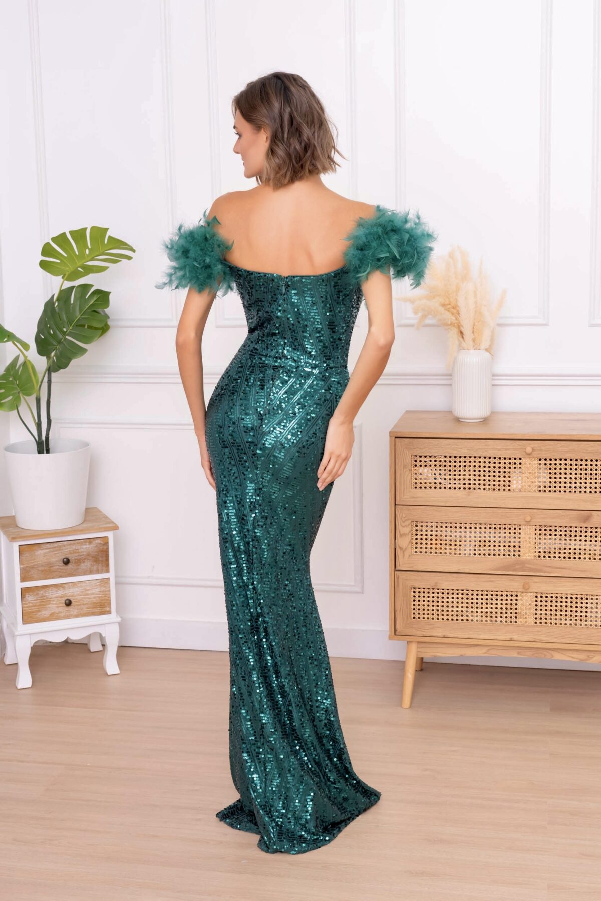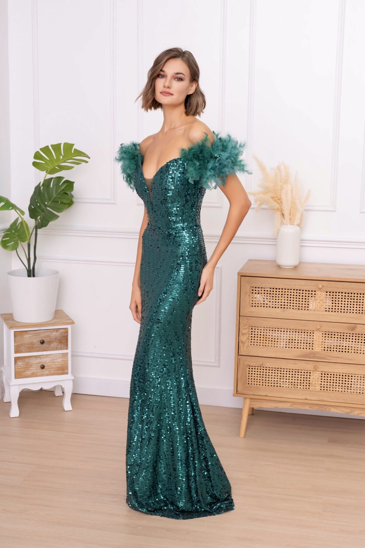 A V-kivágású, dekoltált felsőrész kiemeli a nőies vonalakat, míg az ejtett tollas vállrész drámai és különleges megjelenést biztosít. A sellő fazonú szabás elegánsan követi az alakot, kihangsúlyozva a nőies idomokat.