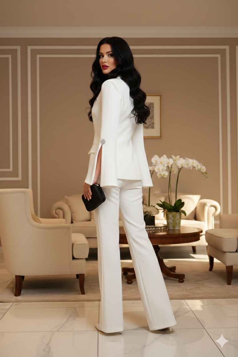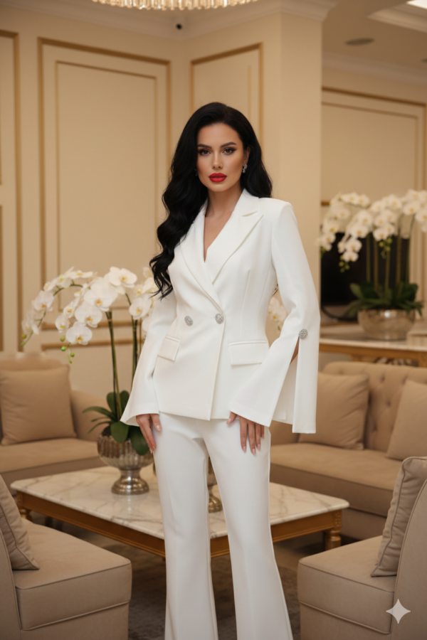 A Beyaz ezüst gombos nadrág kosztüm a modern elegancia és a kifinomult részletek tökéletes találkozása. A karcsúsított zakó gyönyörűen követi az alakot, miközben az ezüst strasszos gombok látványos, mégis ízléses hangsúlyt adnak az összhatásnak. A szatén belső bélés luxus érzetet biztosít, a nyitott végű, tölcsér hatású ujjak pedig igazán különlegessé teszik ezt a darabot.