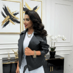 Ez a fekete, 3/4-es ujjú mini kabát tökéletes társad lehet, ha egy vagány és nőies darabra vágysz. A vastagabb műbőr anyag tartást ad, miközben a selymes bélés gondoskodik a kényelmes viseletről. Galléros kialakítása és praktikus zsebei elegáns, mégis laza megjelenést kölcsönöznek.
