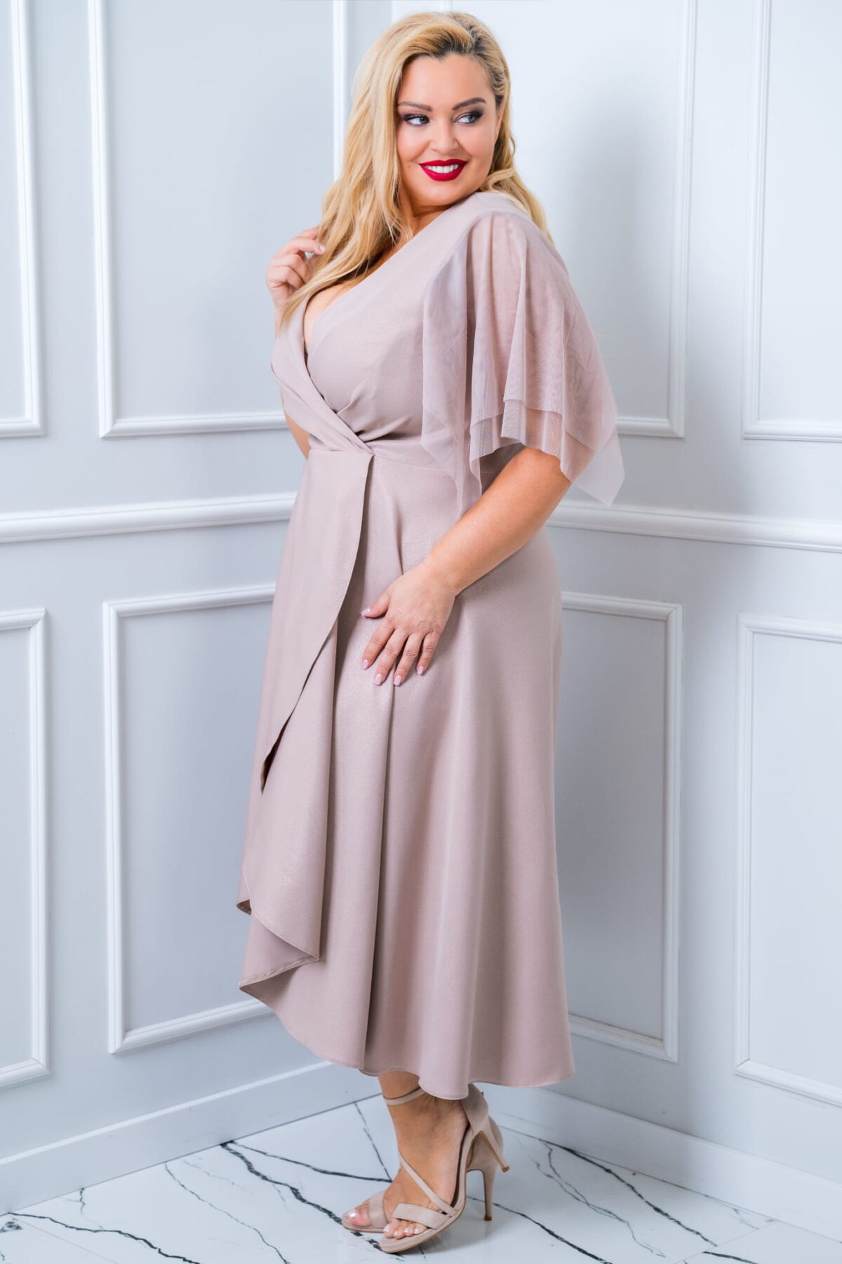 Az Elena aranybarna molett midi ruha tökéletes választás a molett hölgyek számára, akik elegáns és kényelmes viseletre vágynak. A V-kivágású, átlapolt fazon gyönyörűen kiemeli az alakot, míg a rövid necc lepel ujj és a finoman csillogó anyag exkluzív megjelenést biztosít.