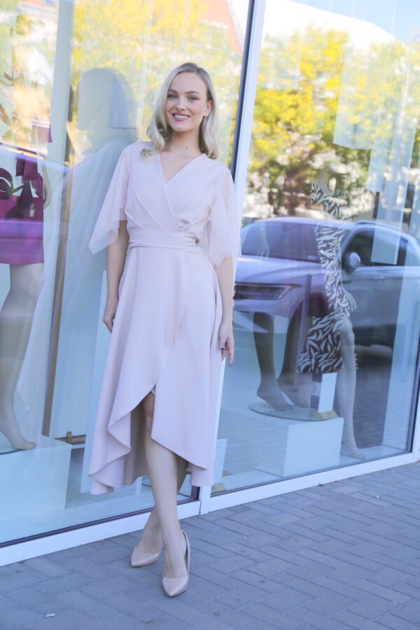Az Elena molett midi ruha tökéletes választás a molett hölgyek számára, akik elegáns és kényelmes viseletre vágynak. A V-kivágású, átlapolt fazon gyönyörűen kiemeli az alakot, míg a rövid necc lepel ujj és a finoman csillogó anyag exkluzív megjelenést biztosít.