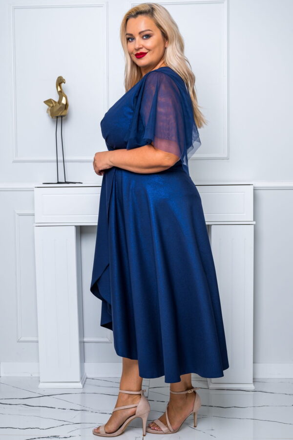 Az Elena molett midi ruha tökéletes választás a molett hölgyek számára, akik elegáns és kényelmes viseletre vágynak. A V-kivágású, átlapolt fazon gyönyörűen kiemeli az alakot, míg a rövid necc lepel ujj és a finoman csillogó anyag exkluzív megjelenést biztosít.