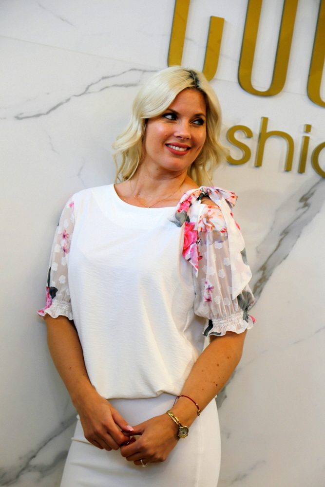 Ez a blúz tökéletes ötvözete az eleganciának és a laza viseletnek. A virágmintás, rövid muszlin ujjak légiesen könnyed hatást keltenek, míg a bal vállán található megkötő különleges dizájnelemként szolgál. A bő fazon szabad mozgást biztosít, a gumis alj pedig finoman simul a derékhoz, így szépen formálja az alakot.
