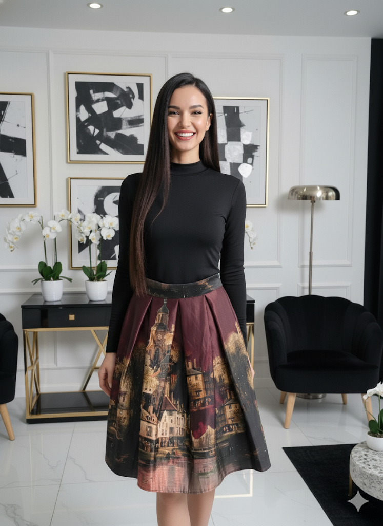 Az A vonalú szabás előnyösen formálja az alakot, miközben szabad mozgást biztosít. A village minta romantikus, nőies hatást kelt, így a szoknya könnyedén viselhető hétköznapokon, de akár alkalmi eseményeken is.