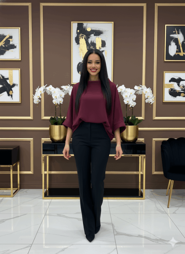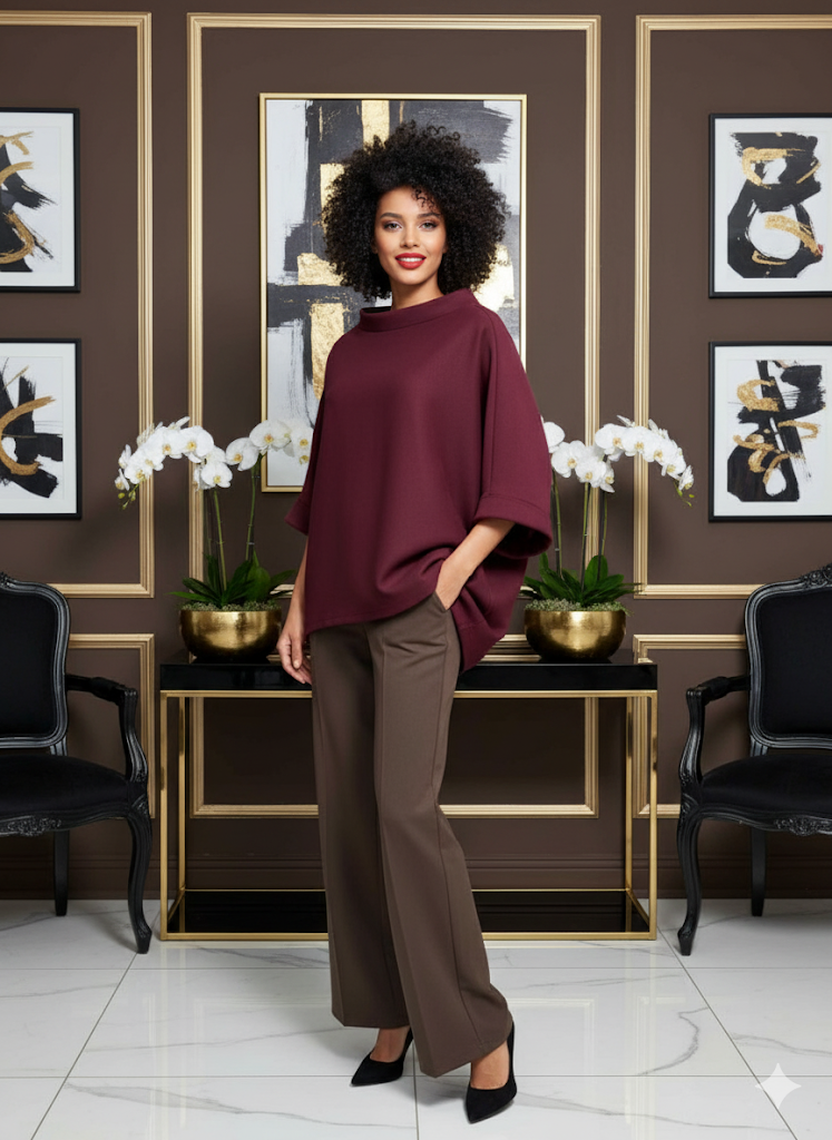 A Capri plus size felső tökéletes választás azoknak, akik szeretik a laza, bő fazont, amely ápol és eltakar. A magasított, kerek nyakkivágás elegáns és időtlen megjelenést biztosít, míg a rövid denevér ujjak extra kényelmet adnak.