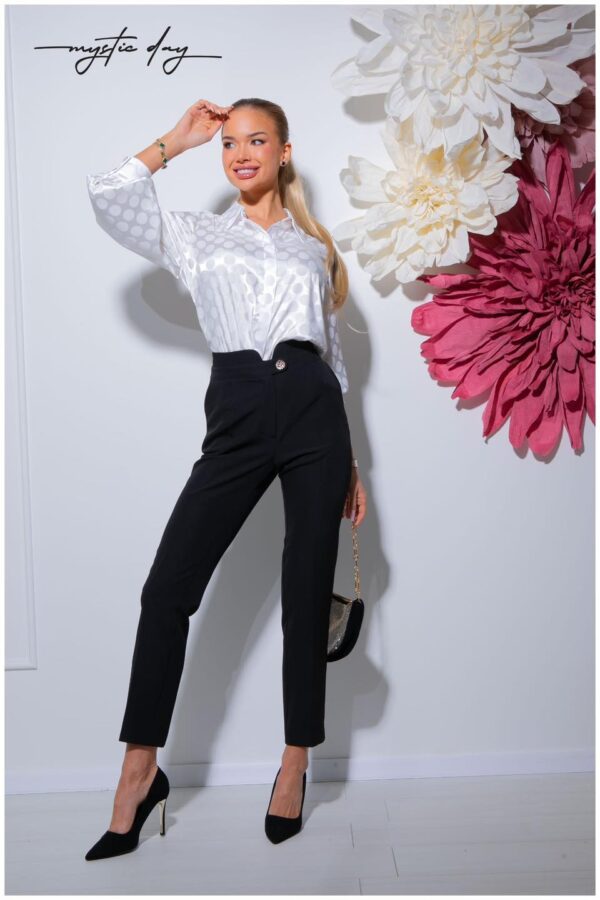 A laza szabás kényelmes viseletet nyújt egész nap. Különösen jól mutat nadrágba vagy szoknyába betűrve, amikor hangsúlyosabbá válik a derékvonal és még nőiesebb az összhatás.