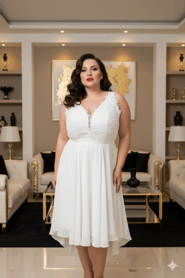 🤍 Csipkés térdig érő fehér gyöngyös push-up muszlin molett ruha – álomszép megjelenés különleges alkalmakra 🤍