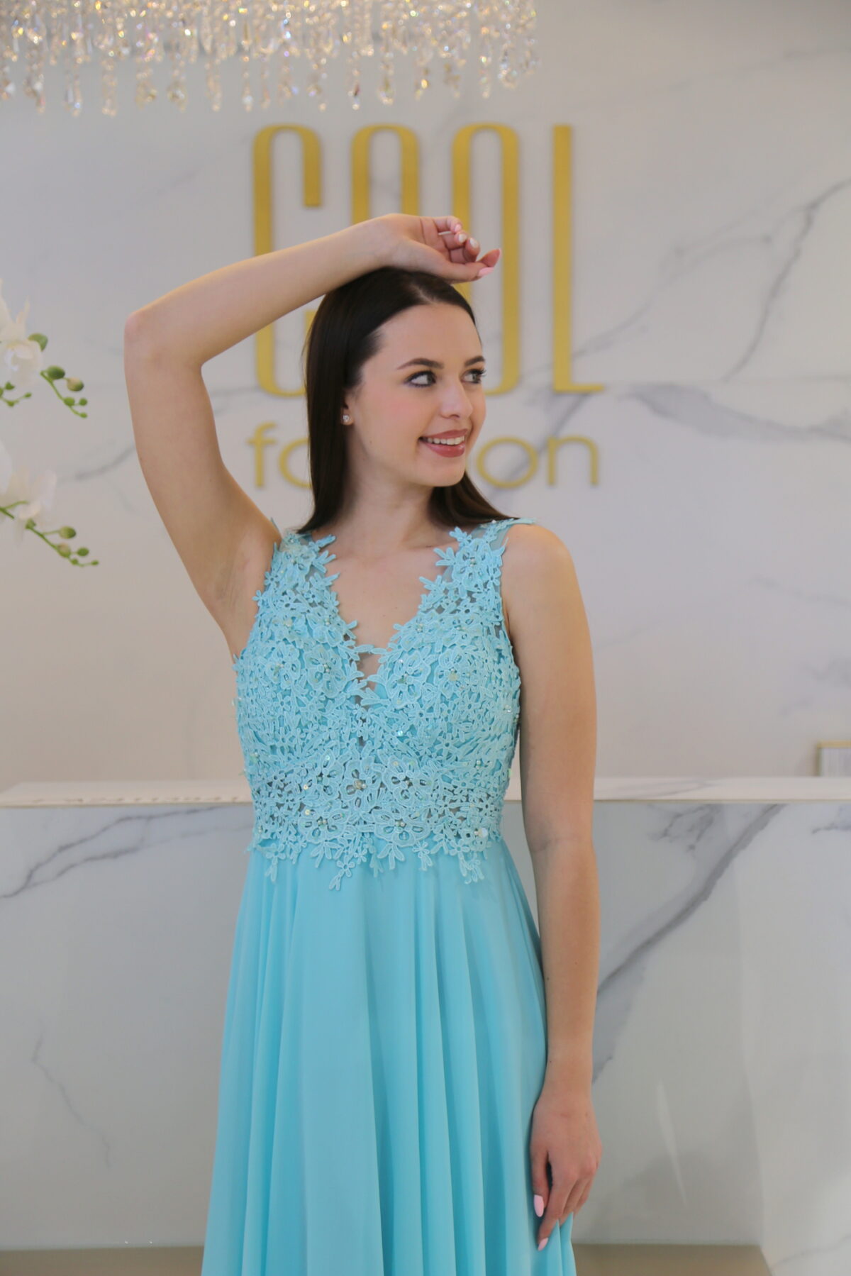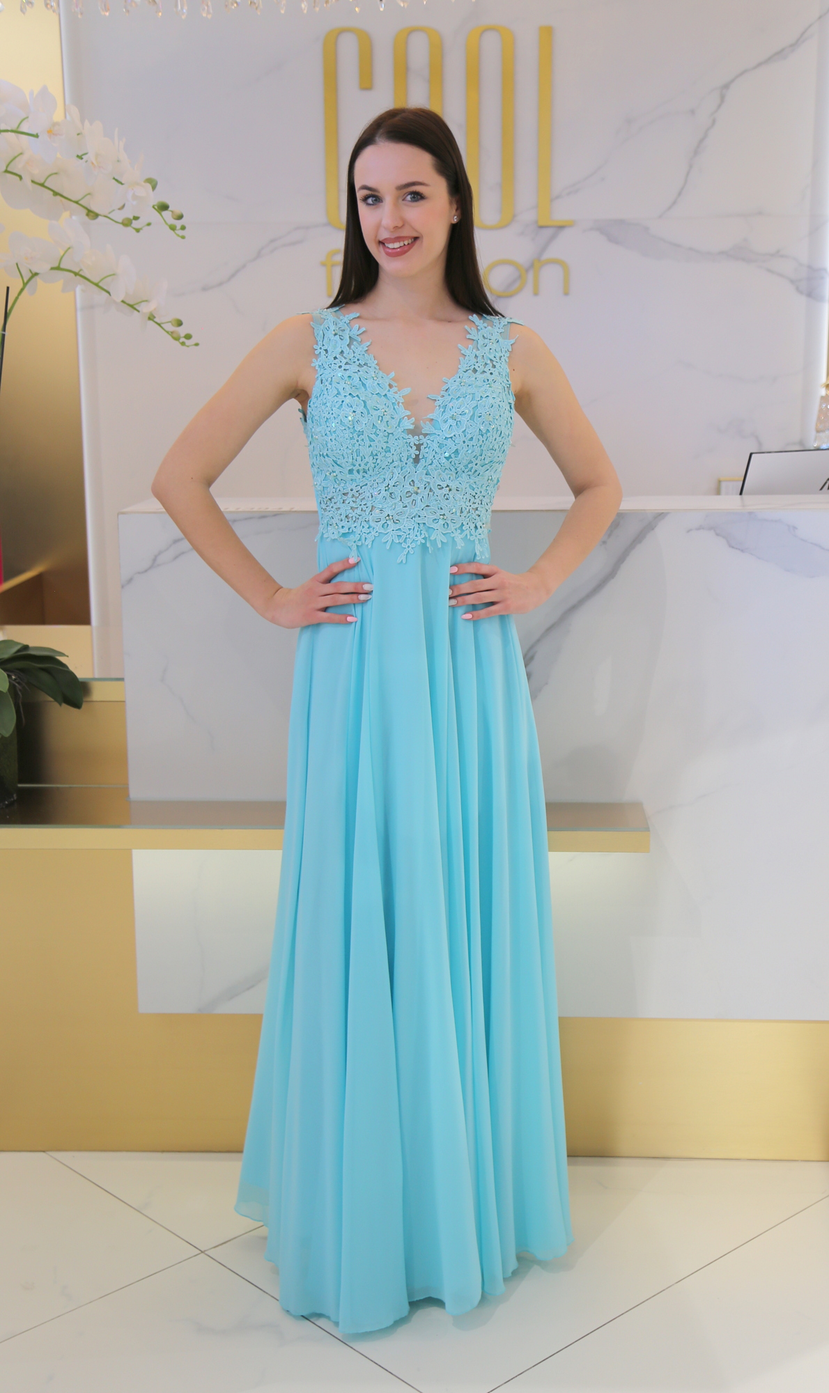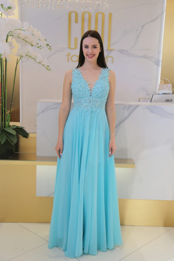 A Csipkés Flitteres Muszlin Maxi Ruha a tökéletes választás, ha egy elegáns, figyelemfelkeltő és nőies megjelenésre vágysz. A mellrészen található finom csipke és a gyöngyökkel és flitterekkel díszített részlet azonnal vonzza a tekinteteket, miközben a muszlin anyag lágy esése és a szatén alsó szoknya még inkább kiemeli a ruha eleganciáját.