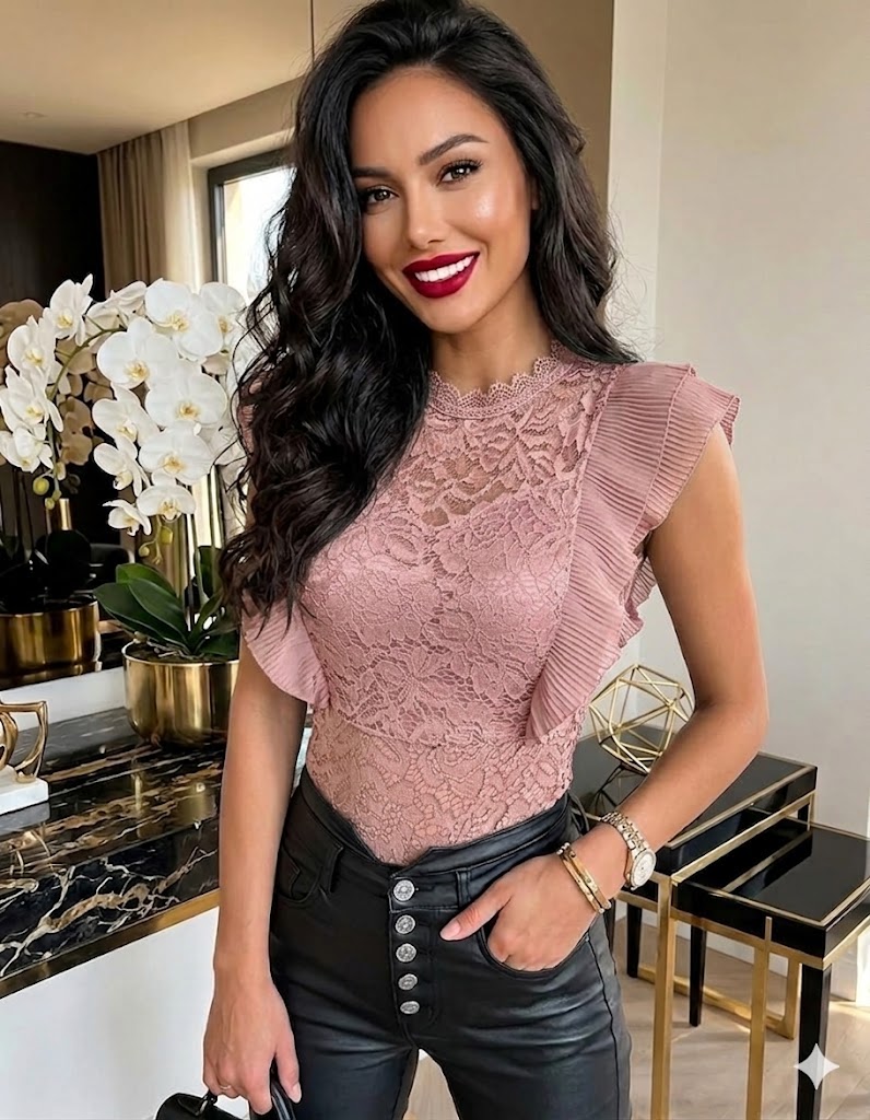 A csipkés pliszírozott body az elegancia és a stílus tökéletes egyensúlyát képviseli. A csipkés részletek, az enyhén fodros, garbós kialakítás és a pliszírozott muszlin vállak mind hozzájárulnak a különleges megjelenéshez. Kényelmes, elasztikus anyaga tökéletesen illeszkedik a testhez, miközben a plusz réteggel ellátott mellrész biztonságos és kényelmes viseletet biztosít.