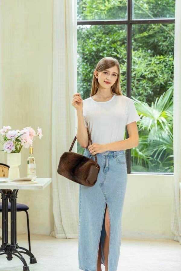 A Dalla bőrbetétes szőrmés táska elegáns és egyedi kiegészítő, amely arany lánccal és fonott fogóval kombinálva stílusos megjelenést biztosít.