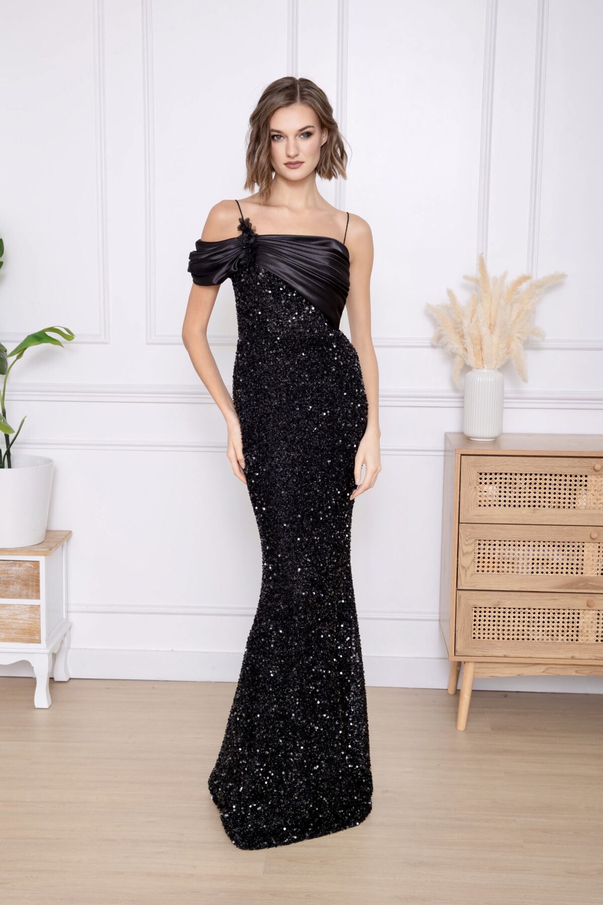 A Demira fekete flitteres ejtett vállas maxi ruha egy olyan alkalmi darab, amely azonnal magára vonja a figyelmet. A ruha testhezálló, alakot kiemelő vonalvezetése, a teljesen flitteres felület és az extra fényhatás igazi luxus megjelenést biztosít.