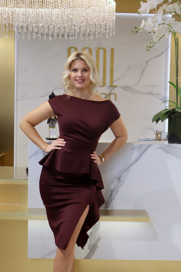 A Denerisz burgundi ruha tökéletes választás elegáns rendezvényekre, munkahelyi eseményekre, vagy akár egy különleges vacsorához. A neoprén anyag, a ceruzafazon és a csavart díszítés kombinációja stílusos, nőies és kényelmes megjelenést biztosít.