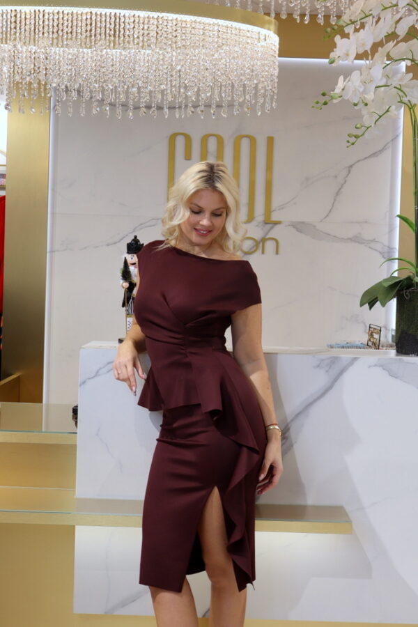 A Denerisz burgundi ruha tökéletes választás azoknak, akik egy elegáns és formás, mégis kényelmes ruhát keresnek. A neoprén anyagú ceruzafazonú ruha kiemeli a nőies vonalakat, miközben modern és egyedi megjelenést biztosít. A hátán cipzáras zárás, enyhe V-kivágás és csavart anyag díszítés a bal oldalon különlegessé teszi ezt a midi fazonú darabot.