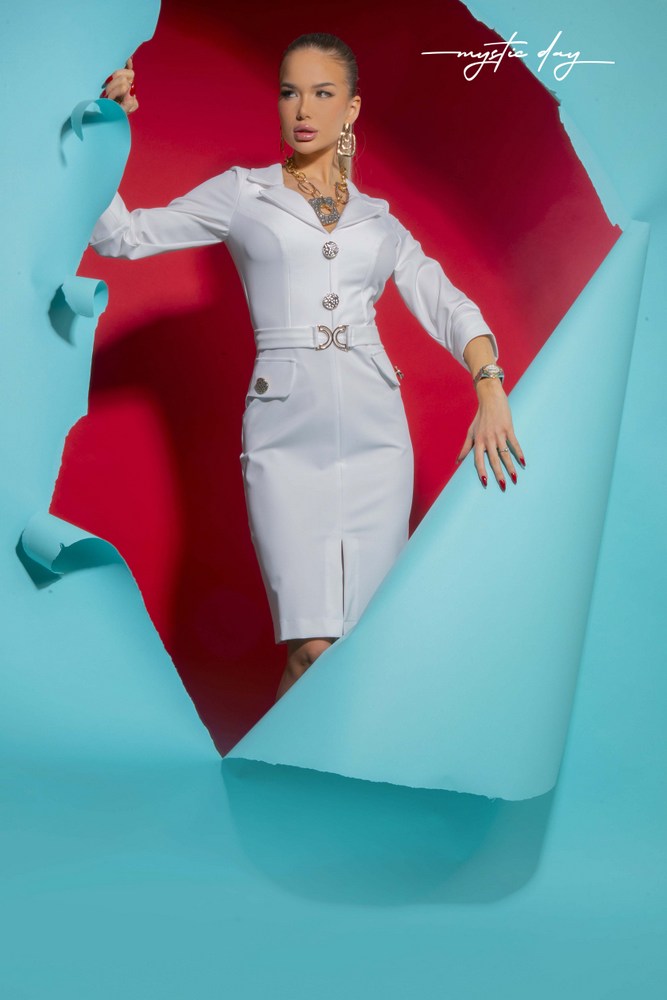 A Diamond ruha egy igazán elegáns darab, amely minden nő gardróbjában megállja a helyét. A háromnegyedes ujj kifinomult és kényelmes viseletet nyújt, így tökéletes választás akár munkahelyi megjelenéshez, akár alkalmi eseményekre. A galléros kialakítás és a dísz gombok különleges, luxus hatású részletek, amelyek egyedivé teszik a ruhát.