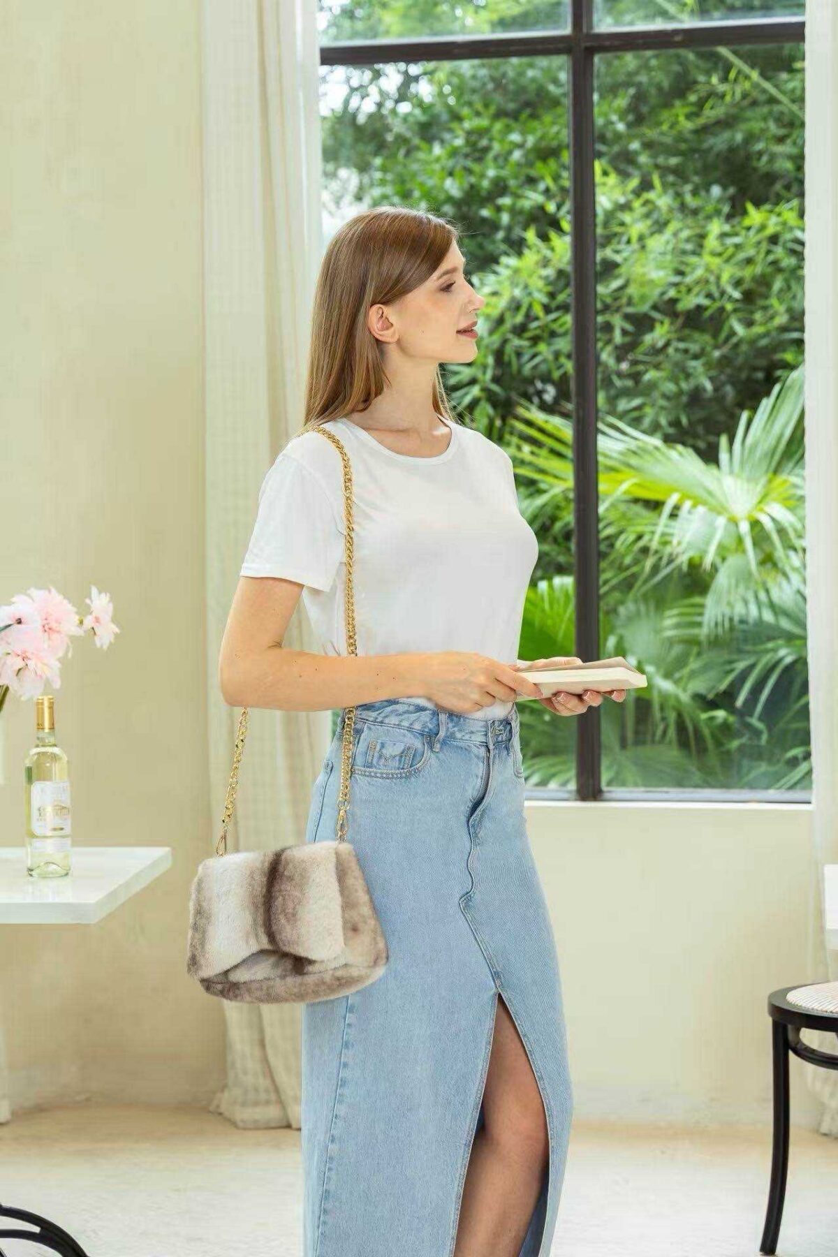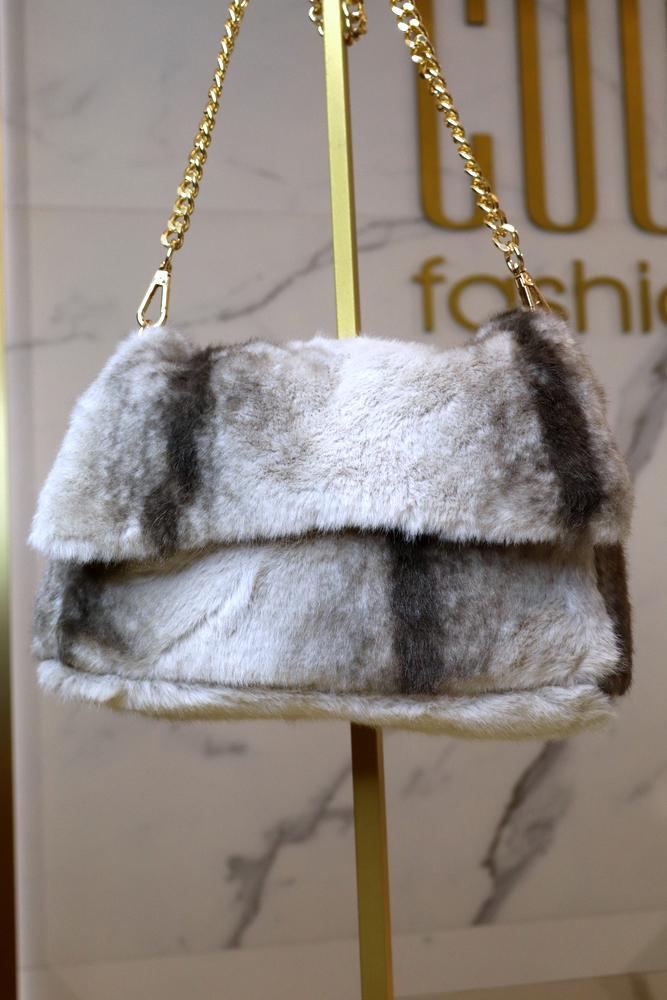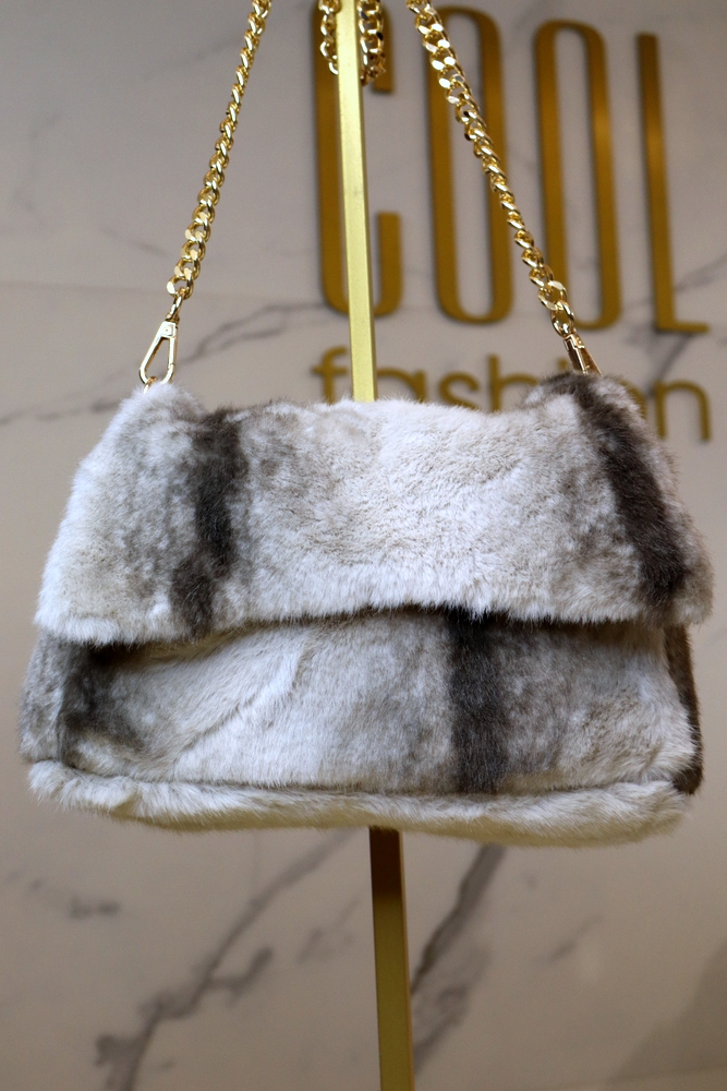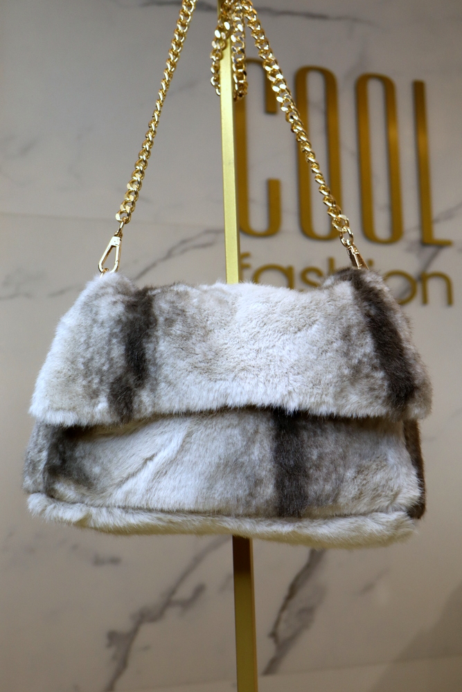 A Dinara szőrmés oldal táska elegáns és praktikus kiegészítő, amely arany lánccal és pattentos záródással stílusos, egyedi megjelenést biztosít.