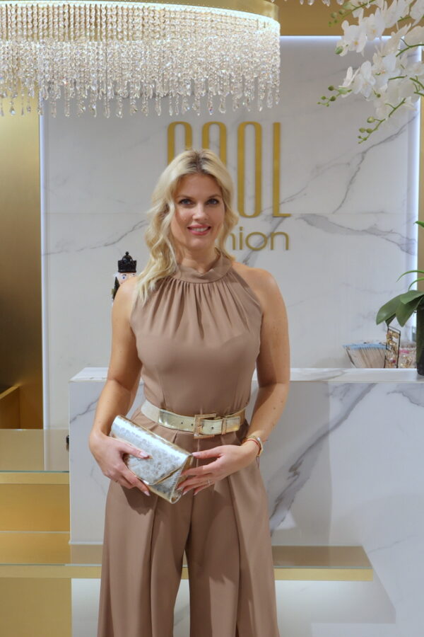 A Dolce Vita drapp overál egy modern, nőies darab, amely egyszerre kényelmes és stílusos. Az ujjatlan, magas nyakú felsőrész és a bőszárú nadrág harmonikus kombinációja laza, mégis kifinomult megjelenést biztosít, míg a hátul elhelyezett cipzár praktikus viseletet tesz lehetővé. Ez az overál tökéletes választás akár különleges alkalmakra, akár elegáns hétköznapi megjelenéshez.
