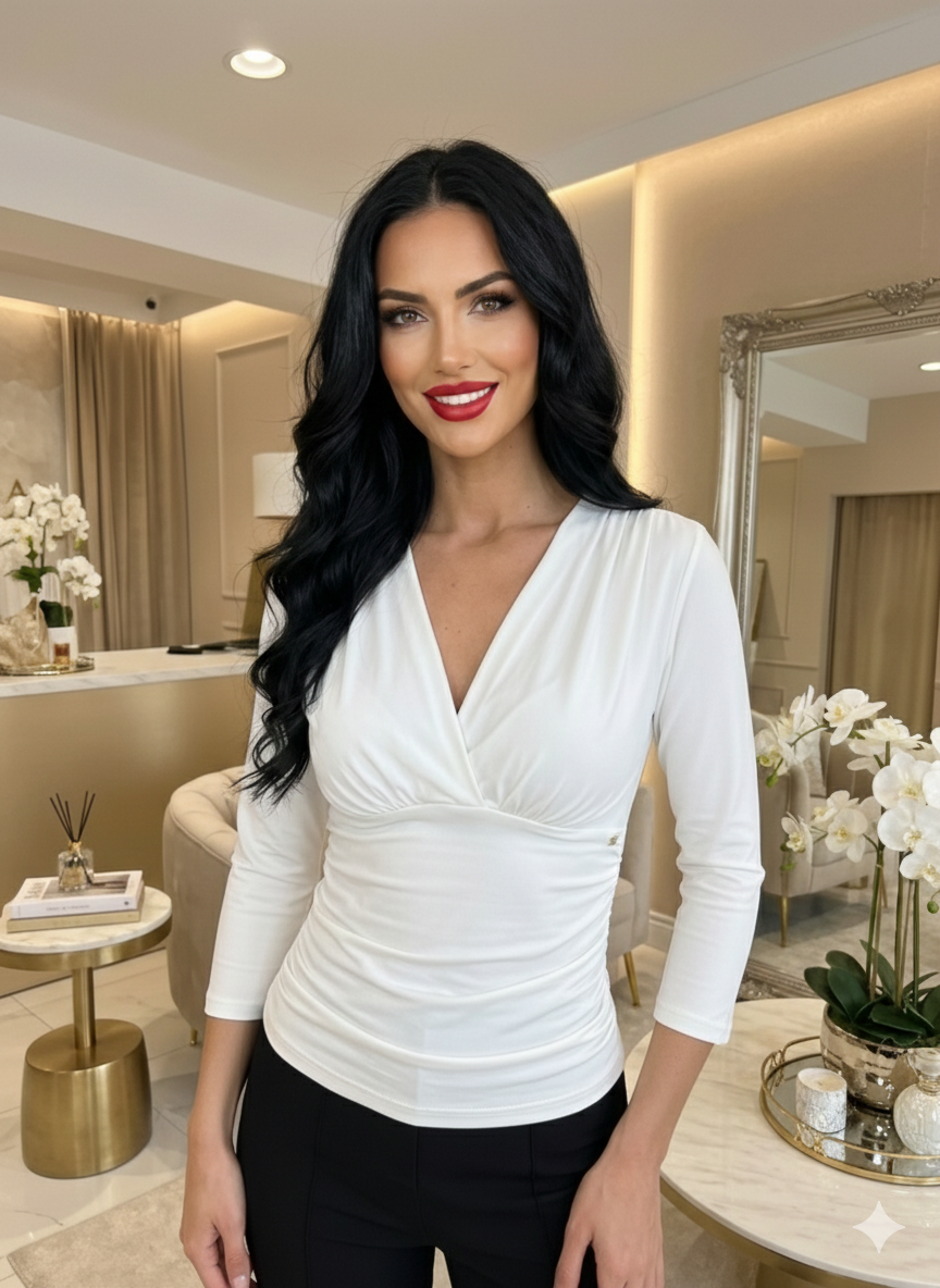 A Doroti 3/4 ujjú felső tökéletes választás azoknak, akik egyszerre keresnek kényelmes és nőies darabot a mindennapokra. A V nyakkivágás optikailag nyújtja a felsőtestet, míg a mell alatti húzás szépen kiemeli a derekat és előnyösen formálja az alakot.