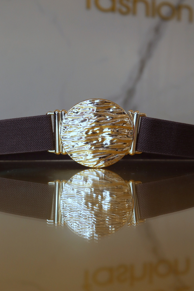 Az Elinor gumis öv elegáns és trendi kiegészítő, amely kiemeli a derékvonalat. A gumis kialakítása kényelmes viseletet biztosít, miközben a fém csat stílusos csillogást ad.
