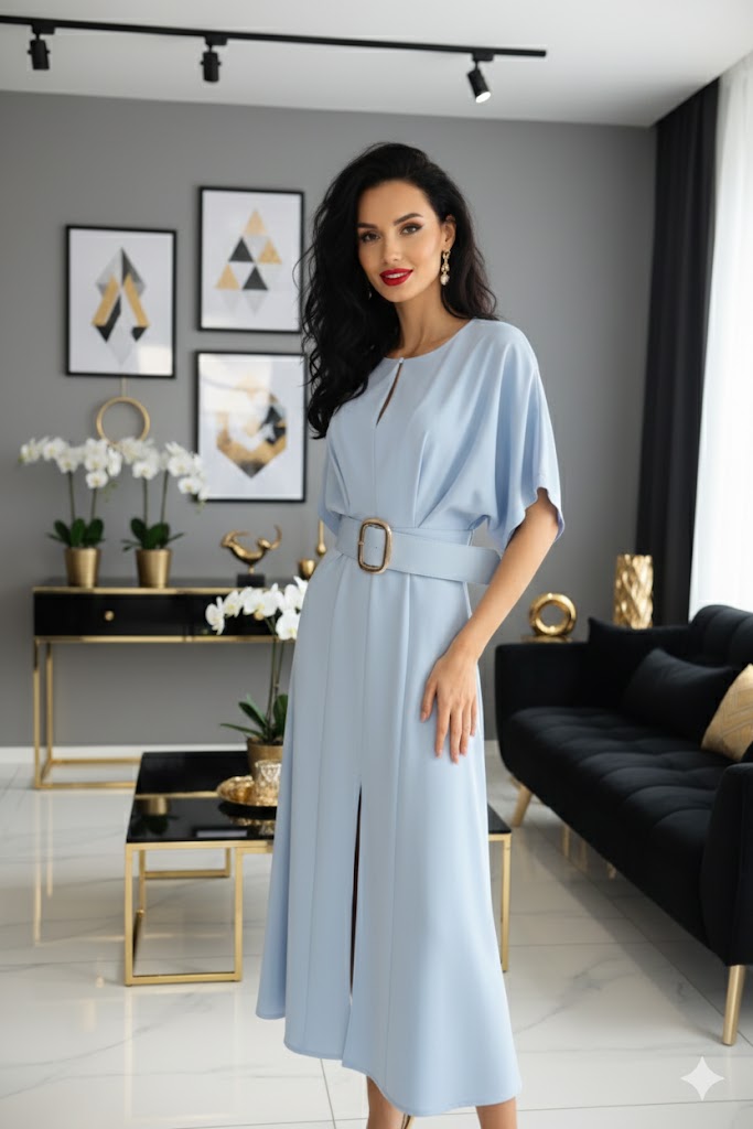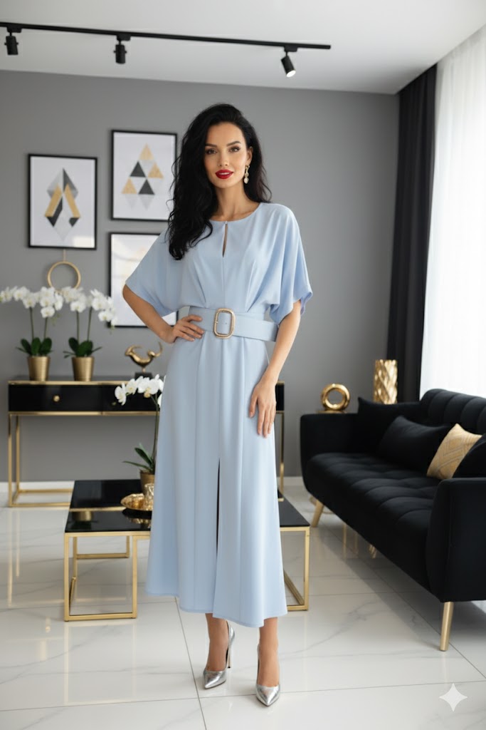 Az Eloria midi ruha egy igazán sokoldalú darab, amely letisztult vonalvezetésével és különleges ujjmegoldásával emelkedik ki a klasszikus midi ruhák közül. A denevér ujjú felsőrész lazán omlik, ezáltal optikailag karcsúsítja a felsőtestet, miközben kényelmes mozgást biztosít egész nap.