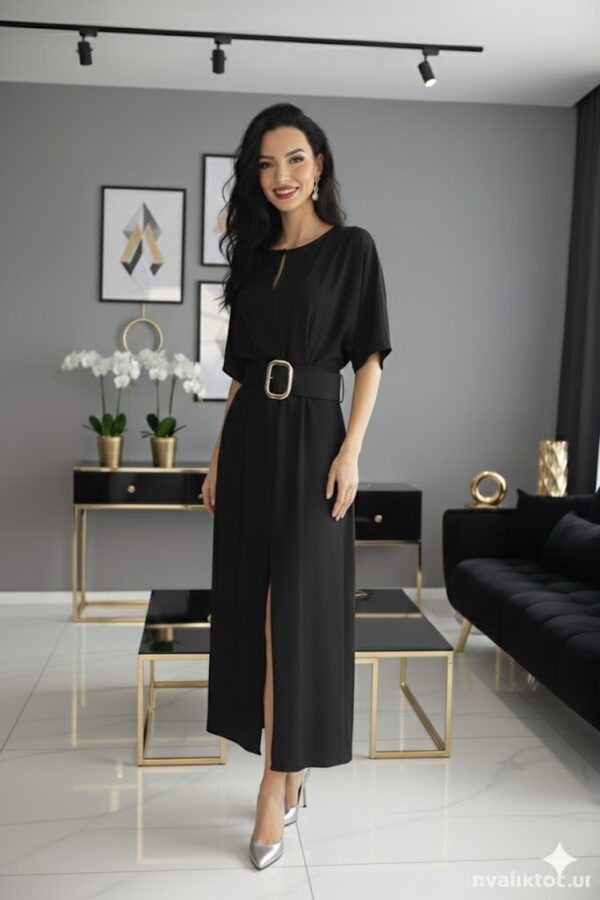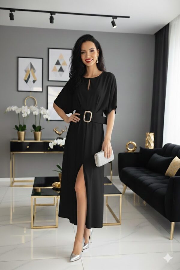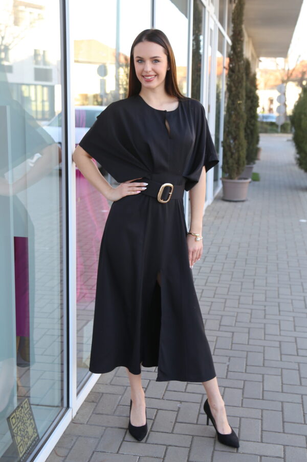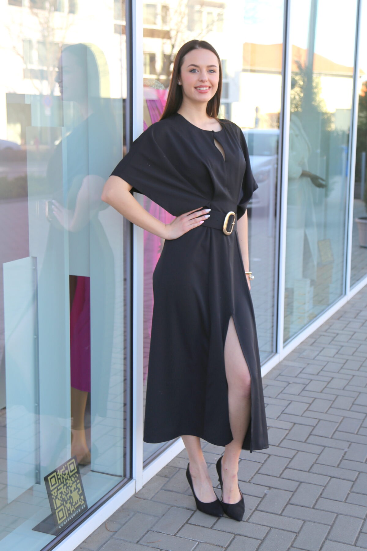 A kerek nyakkivágás időtálló és elegáns, így könnyen kombinálható statement ékszerekkel vagy akár visszafogottabb kiegészítőkkel is. A midi hossz és az elöl felsliccelt szoknyarész nőies megjelenést ad, miközben járás közben szép esést és könnyedséget kölcsönöz a ruhának.