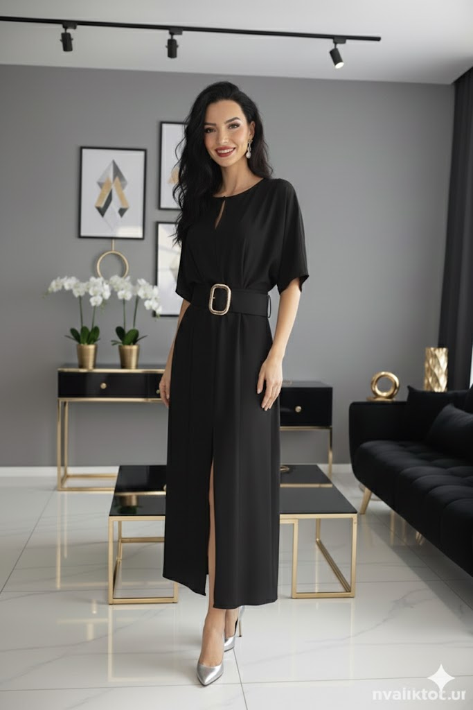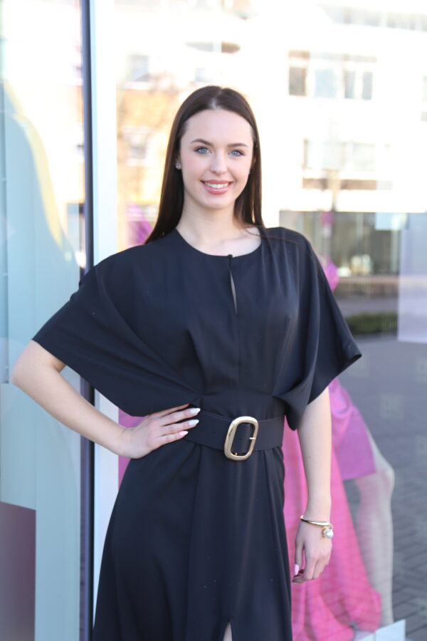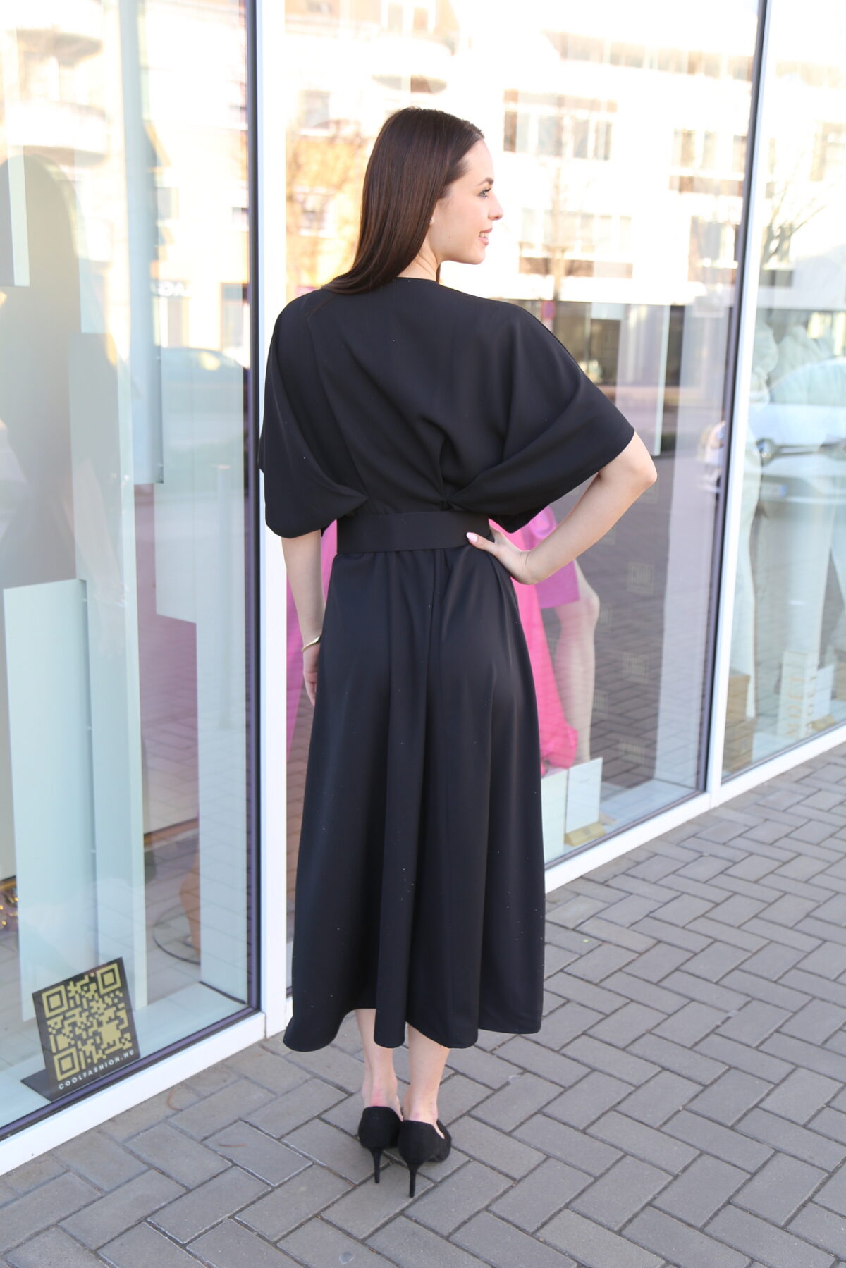 Az Eloria midi ruha egy igazán sokoldalú darab, amely letisztult vonalvezetésével és különleges ujjmegoldásával emelkedik ki a klasszikus midi ruhák közül. A denevér ujjú felsőrész lazán omlik, ezáltal optikailag karcsúsítja a felsőtestet, miközben kényelmes mozgást biztosít egész nap.