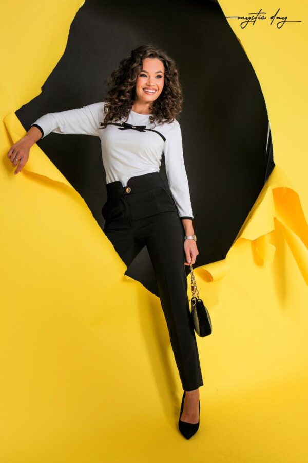 Az Emese háromnegyedes ujjú masnis felső igazi alapdarab, amely mégis különleges megjelenést ad minden szettnek. A kerek nyakkivágás időtlen stílust képvisel, míg az elején elhelyezett masni finom, nőies hangsúlyt ad a felsőnek – pont annyit, amennyitől nem lesz túlzó, mégis figyelemfelkeltő.