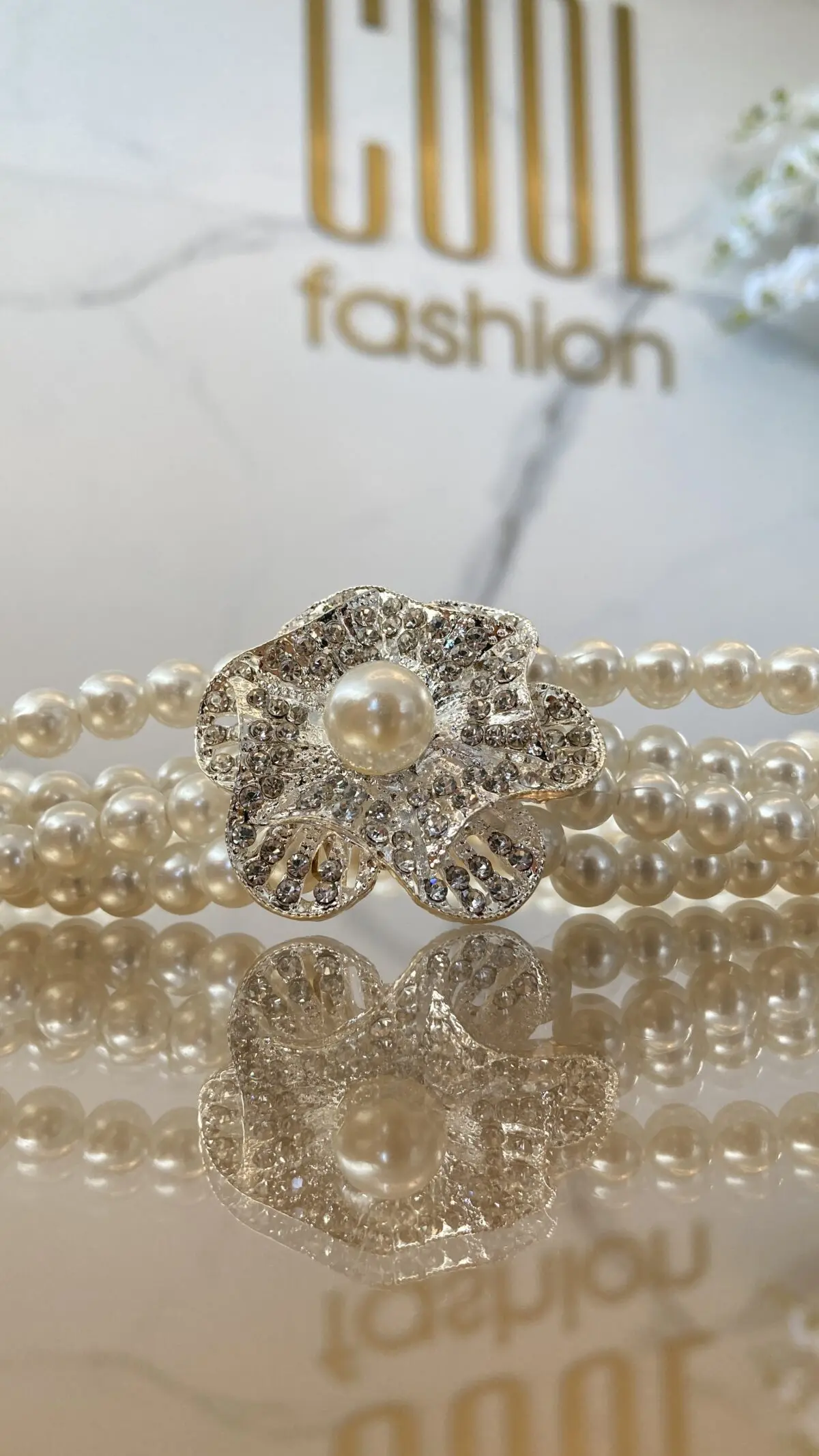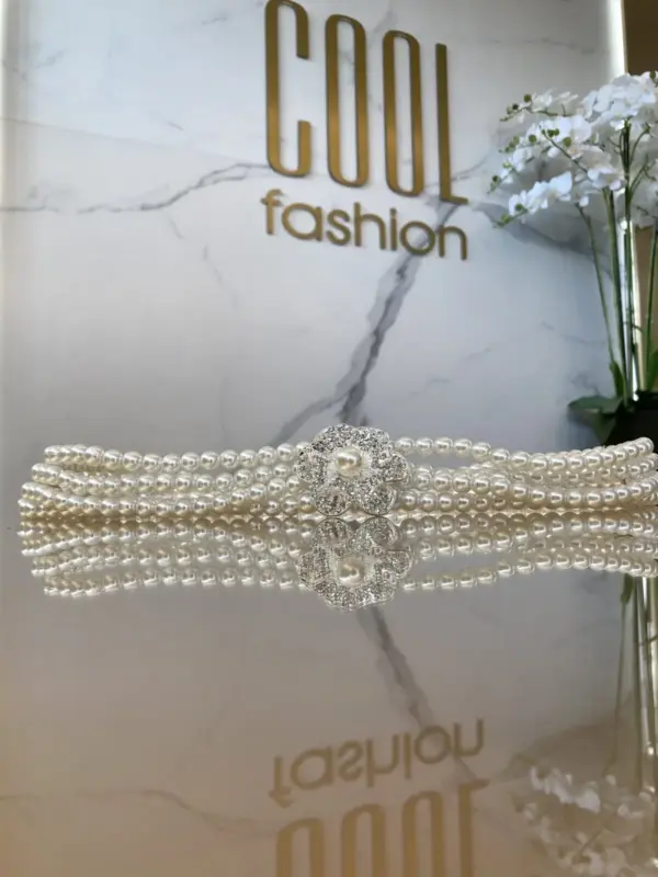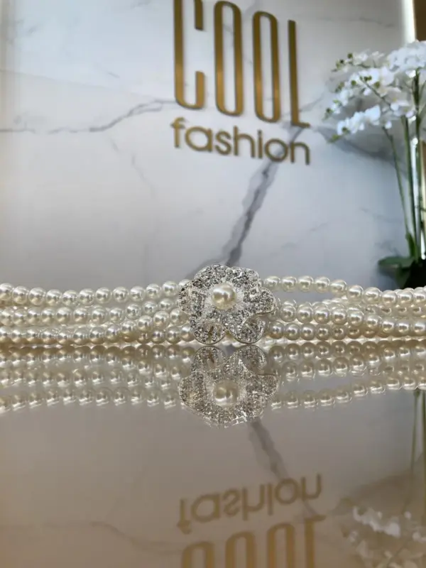A virág csatos gyöngy öv egy exkluzív és nőies kiegészítő, amely tökéletes választás alkalmi és elegáns viseletekhez. Teljes gyöngyös kialakítása kifinomult megjelenést kölcsönöz, míg rugalmas gumis anyaga kényelmes viseletet biztosít. Az arany és ezüst színű csat középpontjában egy csillogó ezüst kő található, amely még különlegesebbé teszi ezt a darabot.