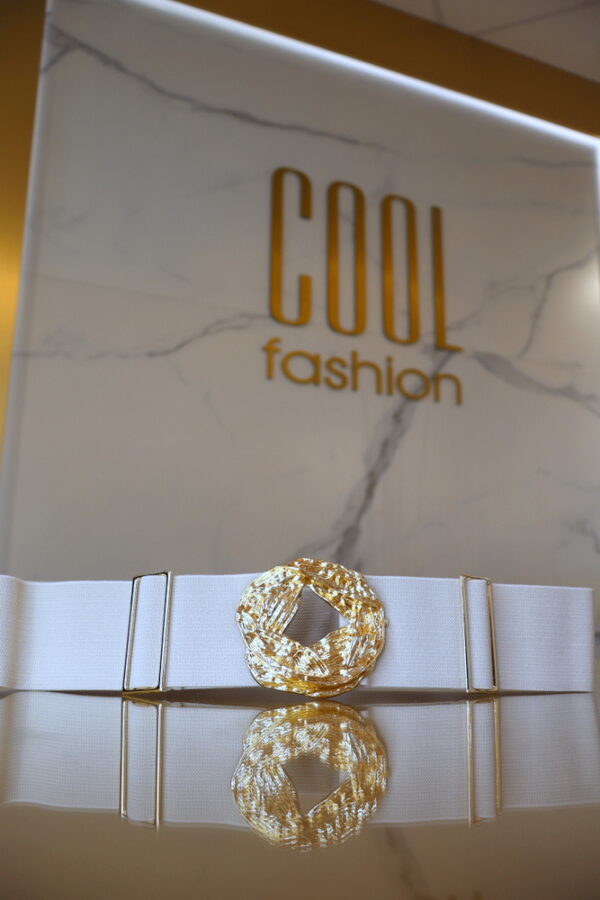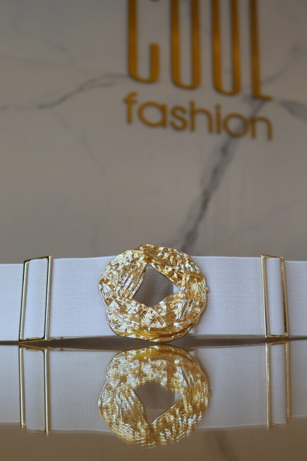 A Florence gumis öv elegáns és trendi kiegészítő, amely kiemeli a derékvonalat. A gumis kialakítása kényelmes viseletet biztosít, miközben az arany csat stílusos csillogást ad.