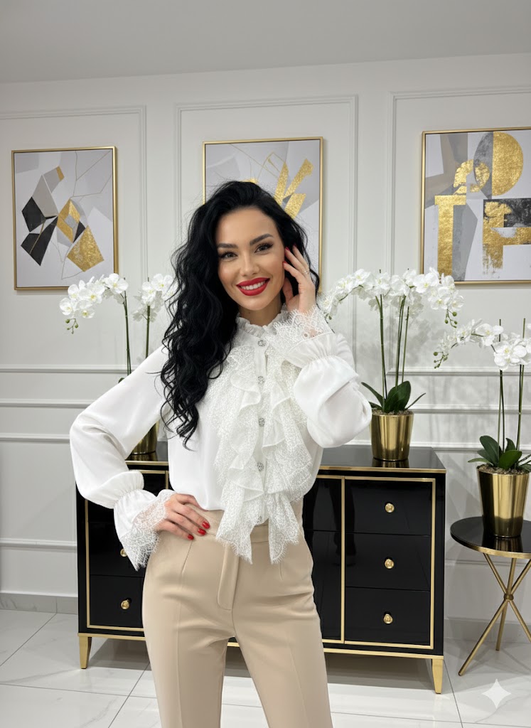 A Grace csipkés zsabós blúzing igazi ékszere lehet a gardróbodnak, ha szereted a nőies, romantikus darabokat. A finom muszlinos anyag légiesen simul a testre, miközben a csipkés és zsabós részletek különleges, elegáns megjelenést kölcsönöznek.