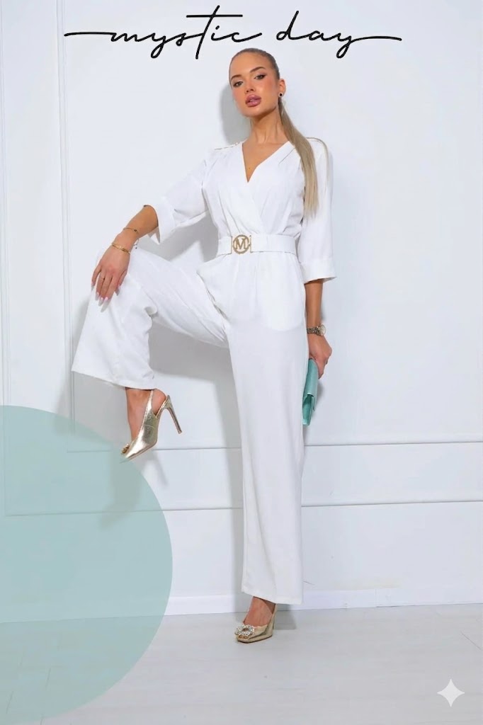 A V kivágott, átlapolt mellrész nőies és előnyös szabást kölcsönöz, amely kiemeli a dekoltázst és karcsúsítja az alakot. Az overál derékrészét az öv teszi hangsúlyossá, így mindig tökéletes sziluettet biztosít.