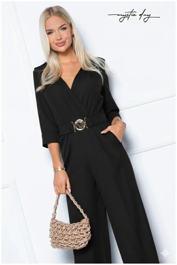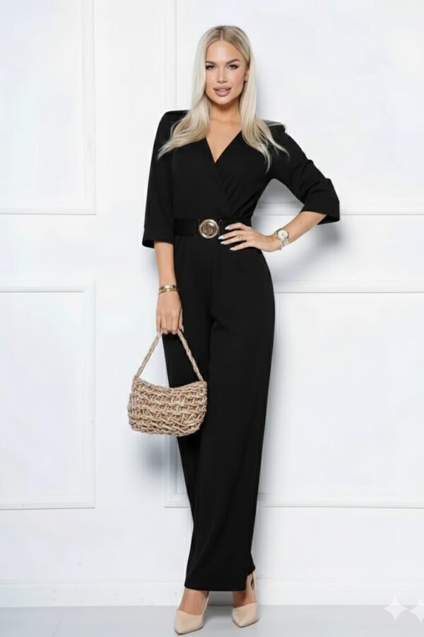 A V kivágott, átlapolt mellrész nőies és előnyös szabást kölcsönöz, amely kiemeli a dekoltázst és karcsúsítja az alakot. Az overál derékrészét az öv teszi hangsúlyossá, így mindig tökéletes sziluettet biztosít.