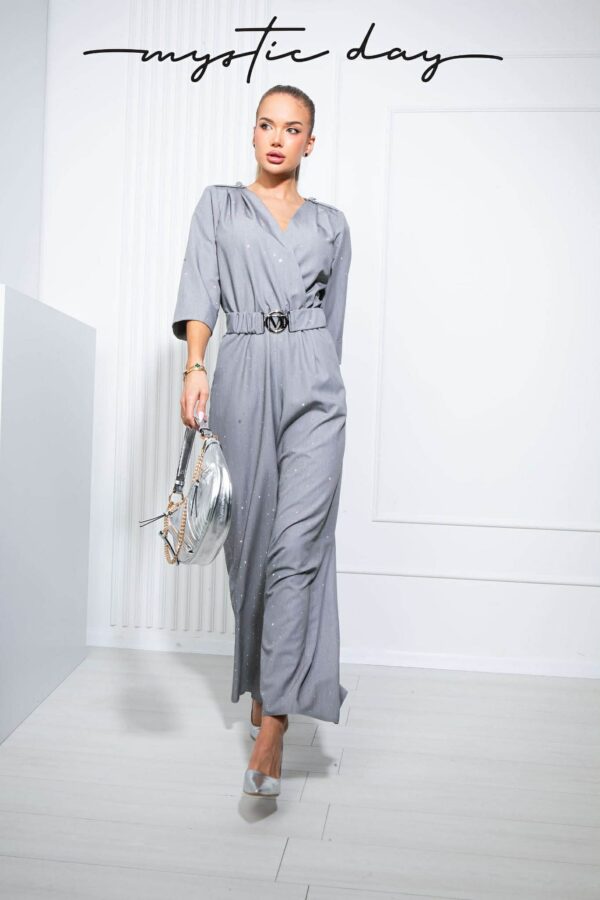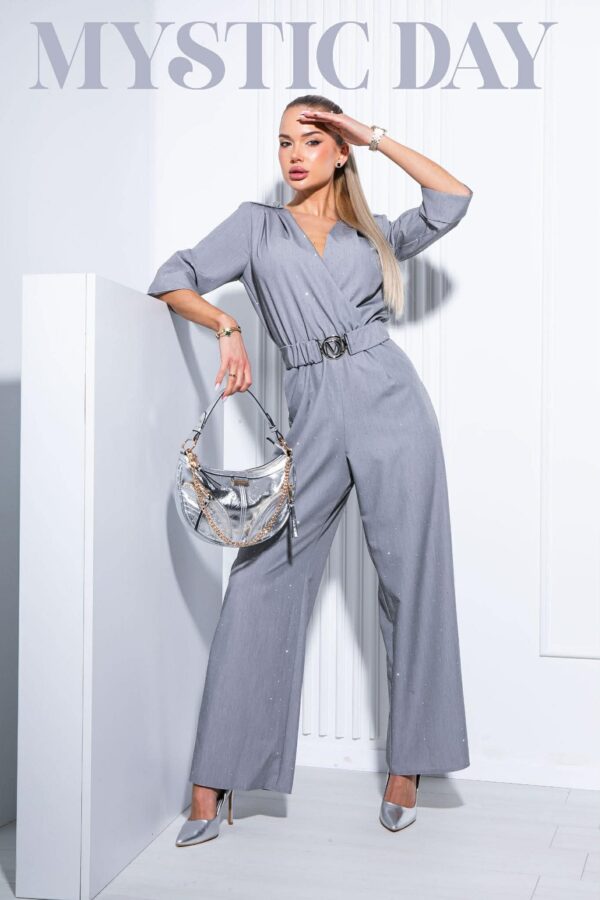 A V kivágott, átlapolt mellrész nőies és előnyös szabást kölcsönöz, amely kiemeli a dekoltázst és karcsúsítja az alakot. Az overál derékrészét az öv teszi hangsúlyossá, így mindig tökéletes sziluettet biztosít.