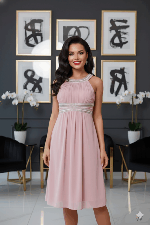 A gyöngyös muszlin A-vonalú térd ruha tökéletes választás azoknak, akik szeretik a letisztult eleganciát egy kis csillogással megfűszerezve. A kerek nyakú, görög ihletésű fazon finoman követi a test vonalát, míg a nyaknál és mell alatt elhelyezett köves, gyöngyös díszítés elegáns hangsúlyt ad a ruha felső részének.