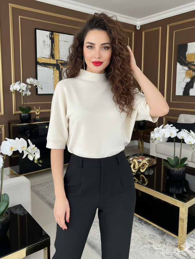A magas nyakú kialakítás elegáns, mégis praktikus, így irodai viseletként és hétköznapi outfitek részeként is remekül megállja a helyét. A 3/4-es ujjhossz és a rugalmas anyag biztosítja, hogy mindig komfortosan érezd magad benne, bármilyen testalkattal is rendelkezel.